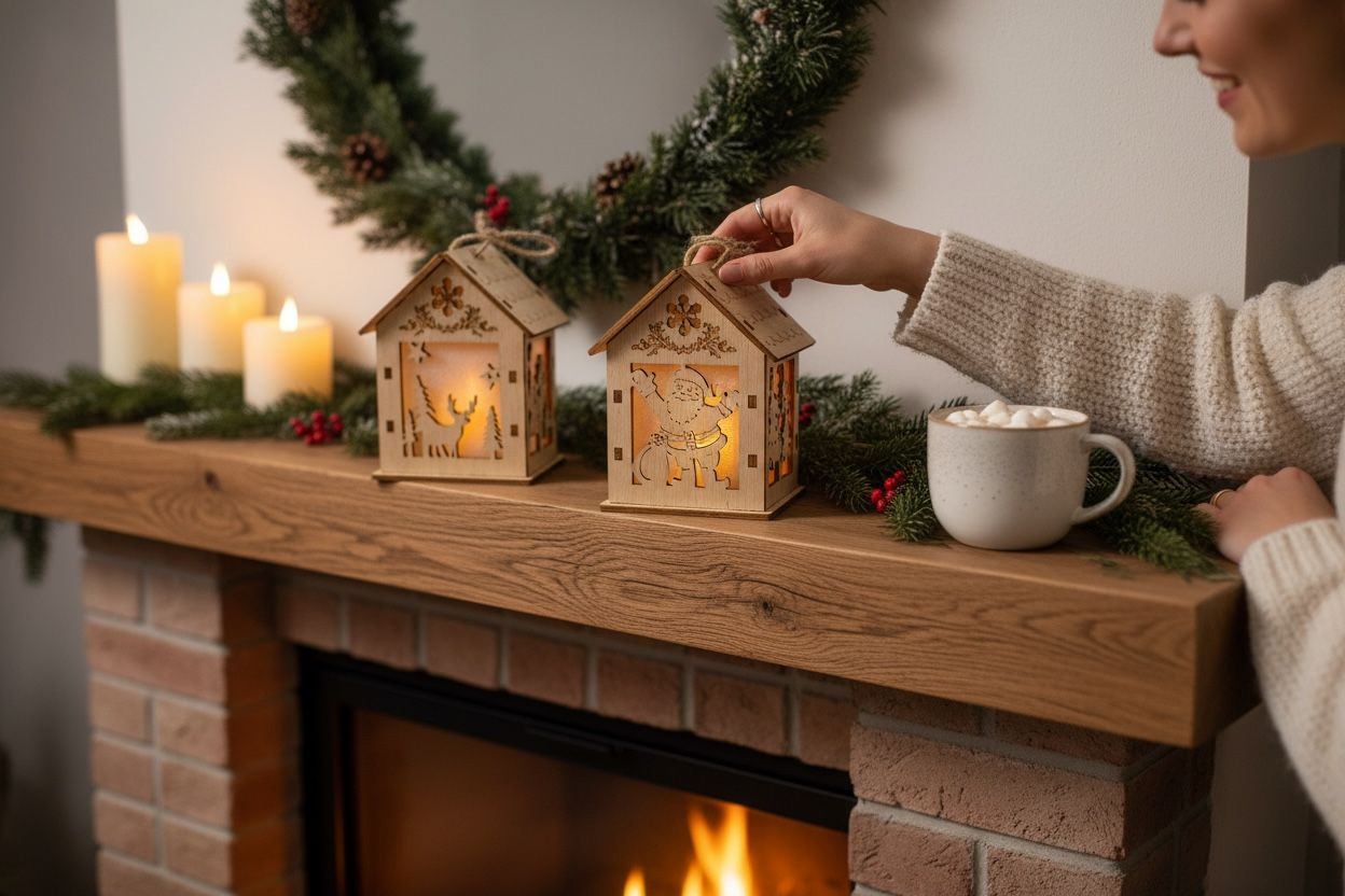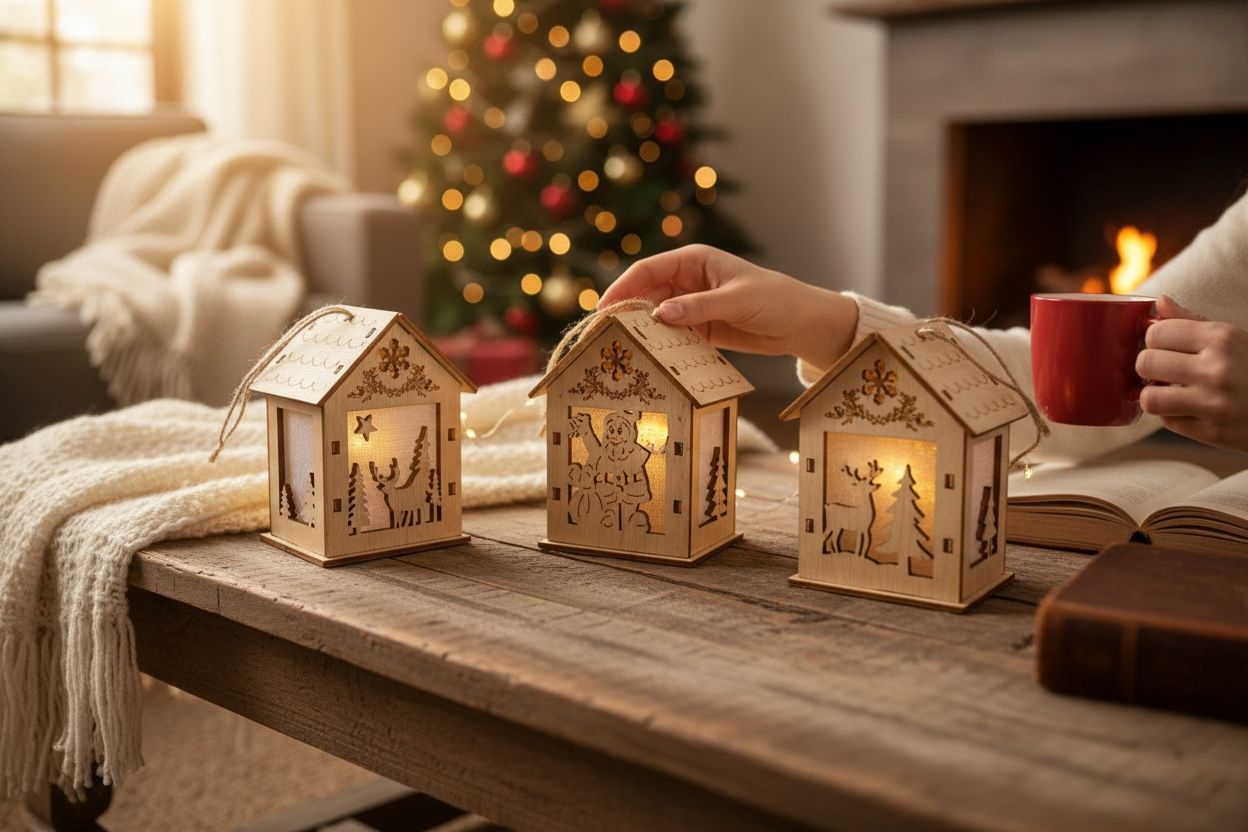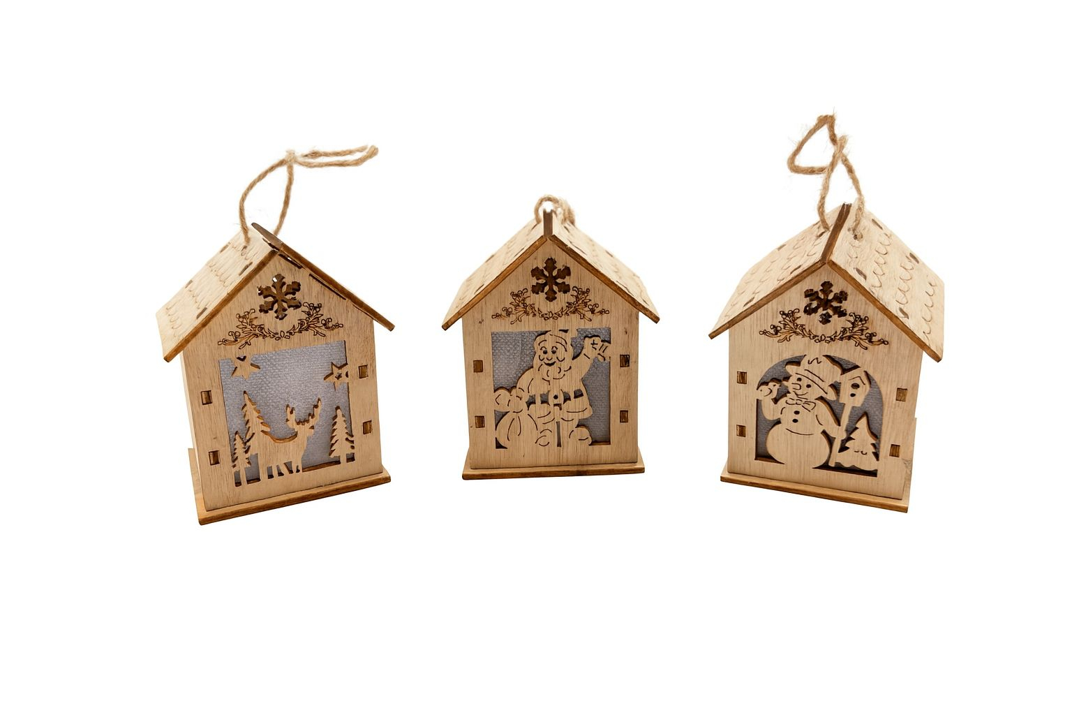 Adauga magie decorului de sarbatori cu aceasta casuta din lemn cu lumini LED, perfect realizata pentru a crea o atmosfera calda si festiva. Fiecare casuta este confectionata din lemn natural si prezinta un model decupat: ren, Mos Craciun sau om de zapada.