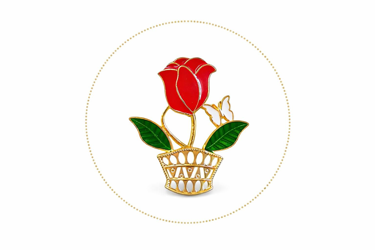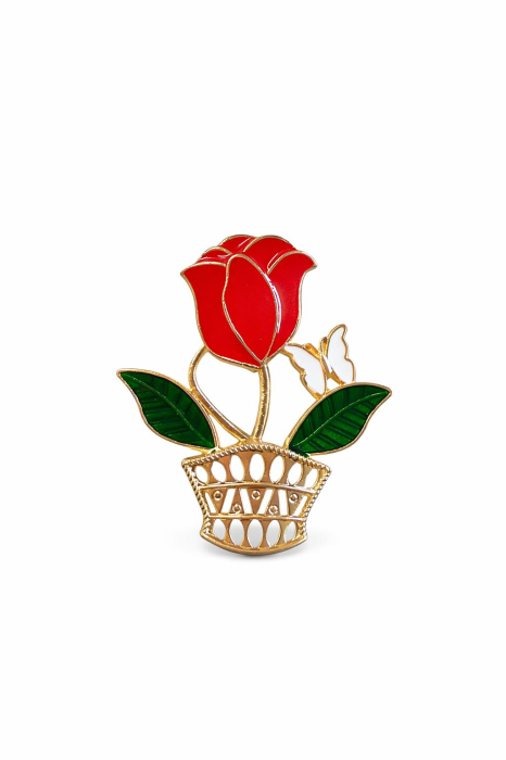 Aceasta brosa martisor decorativa, cu dimensiunea de aproximativ 4 x 4 cm, are un finisaj auriu si detalii din email (rosu, verde, alb). Designul prezinta un trandafir rosu inmugurit intr-un cosulet auriu stilizat, alaturi de frunze verzi si un mic fluture alb. Trandafirul simbolizeaza dragostea si pasiunea, in timp ce cosuletul si fluturele evoca primavara, renasterea si norocul. Culorile vii si finisajul lucios ofera un aspect vibrant si elegant. Prinderea este de tip brosa, sigura si usor de prins la rever, esarfa, palarie sau pe geanta, fiind ideala ca martisor, accesoriu vestimentar pentru ocazii speciale (nunti, petreceri) sau cadou de 1 si 8 martie. Este un accesoriu versatil ce aduce un plus de rafinament oricarei tinute, pastrand vie traditia martisorului si emana un sentiment de unicitate.