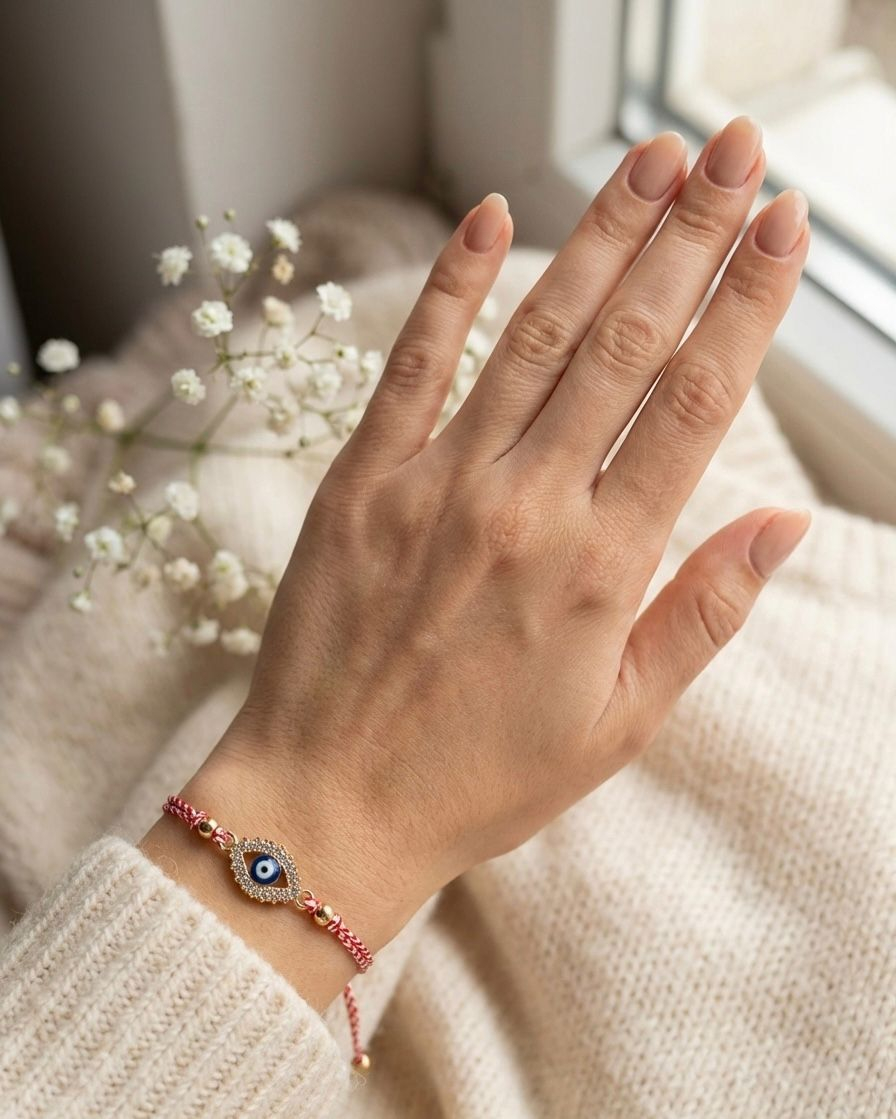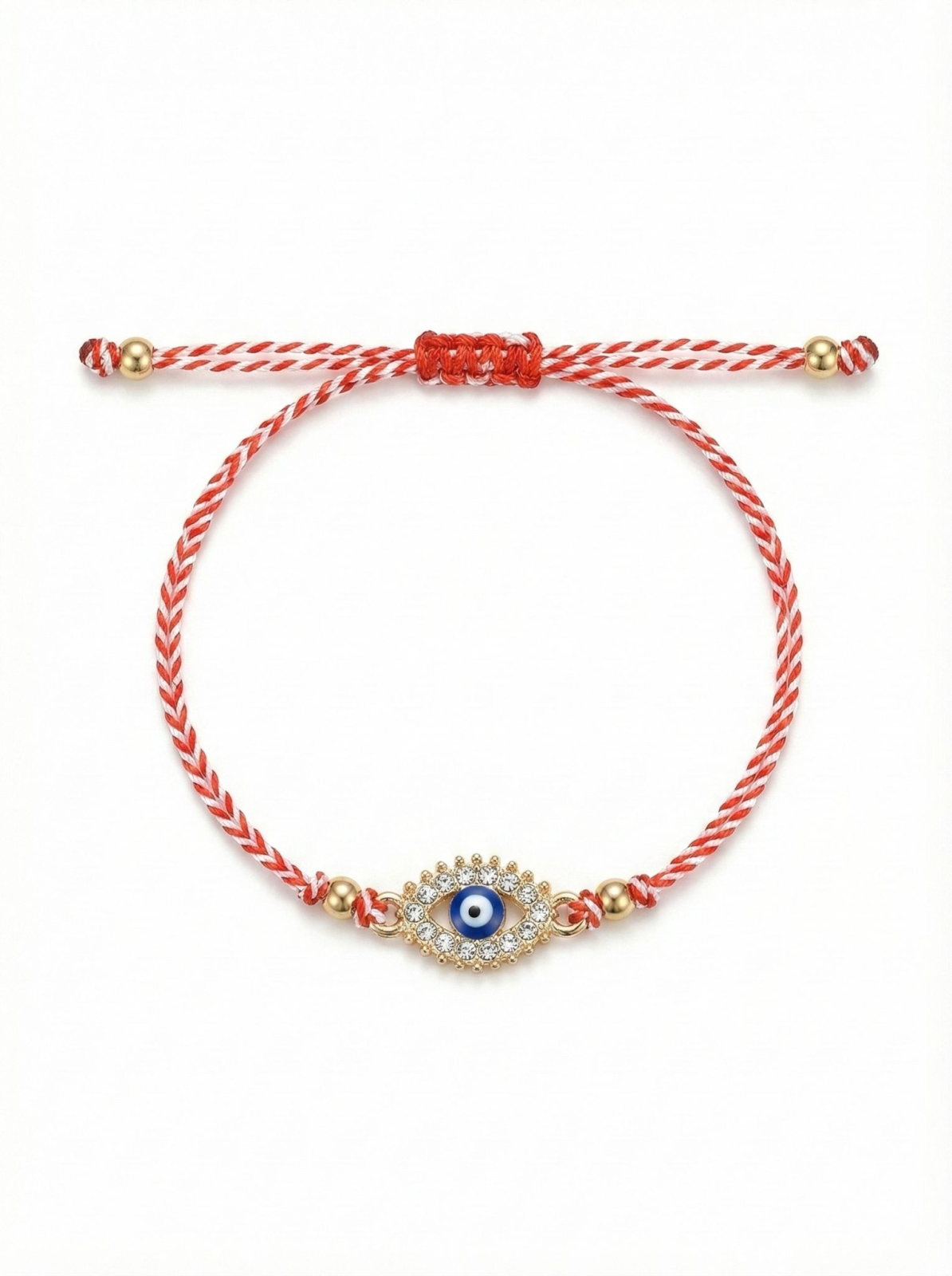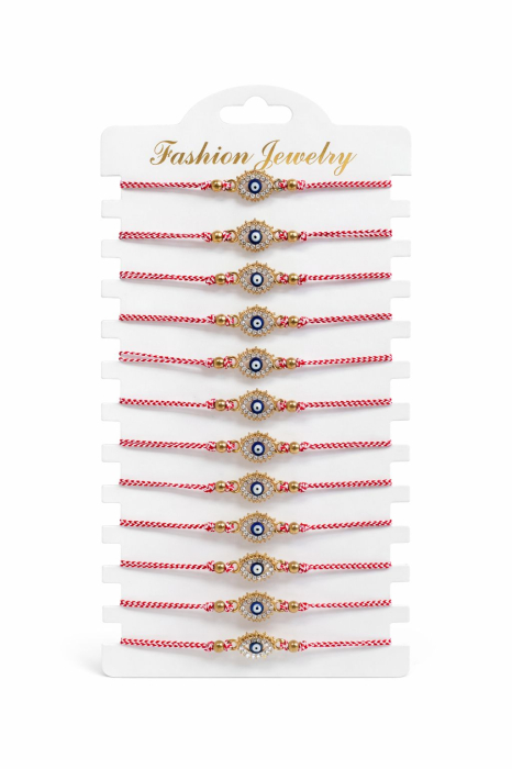 Setul contine 12 bratari martisor realizate pe snur impletit rosu cu alb, prevazute cu sistem de reglare pentru potrivire confortabila pe orice incheietura. Fiecare bratara este decorata cu un talisman protector auriu, ornamentat cu strasuri fine si simbol central de tip ochi protector, recunoscut pentru semnificatia sa de protectie impotriva energiilor negative si aducere a norocului. Combinatia de rosu si alb reprezinta traditia martisorului, vitalitatea si reinnoirea, iar detaliile aurii adauga un aspect elegant si rafinat. Setul este prezentat pe suport de carton si este ideal pentru a fi oferit cadou de martisor, la evenimente, in scoli sau pentru vanzare individuala.