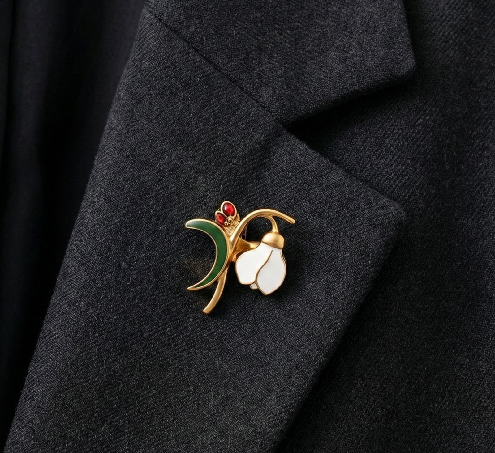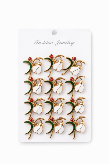 Sarbatoreste renasterea naturii cu acest set 12 brose Martisor, 17x10 cm, Ghiocel cu buburuza. Designul imbina puritatea ghiocelului alb cu pata de culoare adusa de buburuza rosie, creand un accesoriu plin de farmec ce simbolizeaza speranta si protectia.