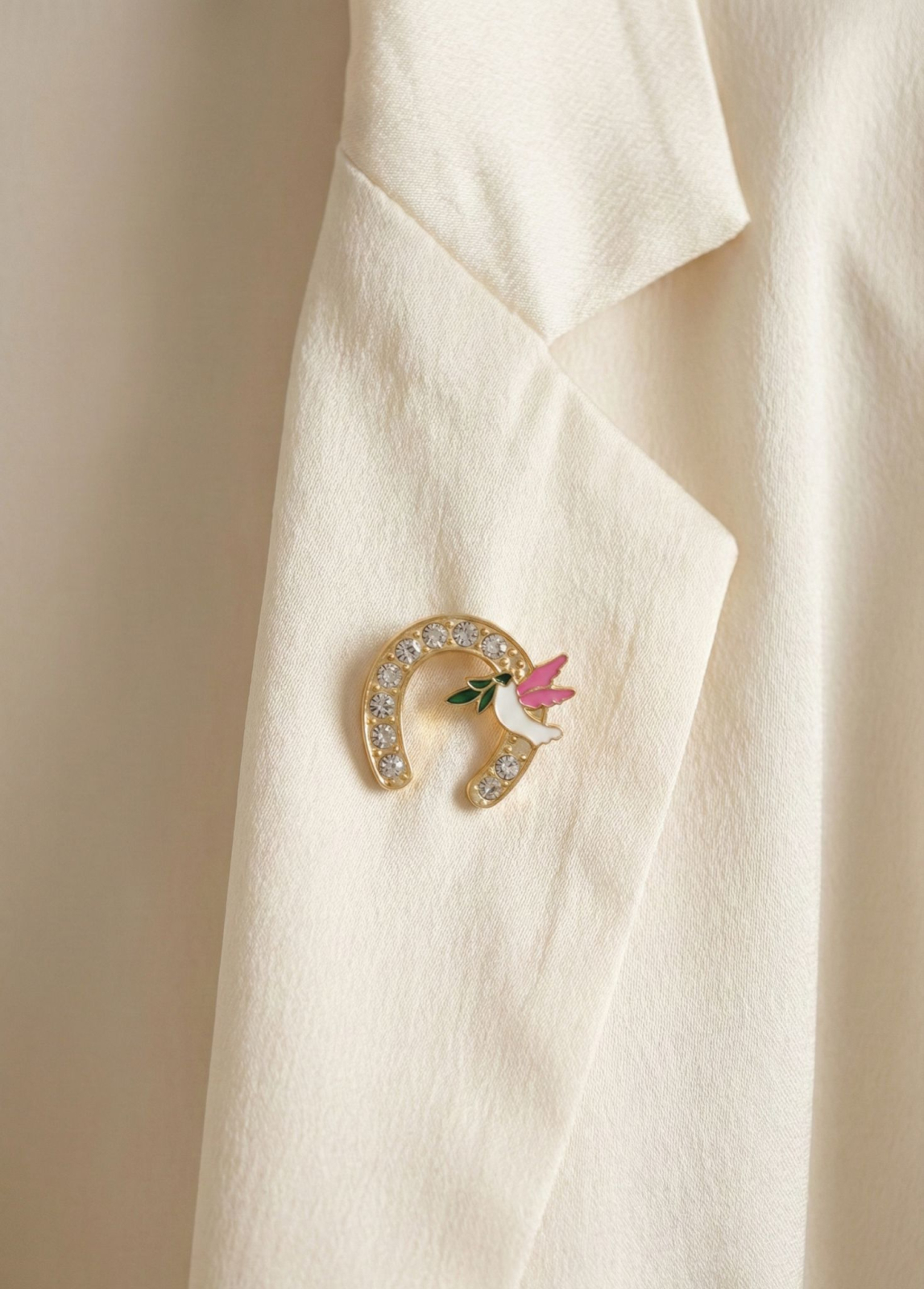 Sarbatoresc venirea primaverii cu acest set 12 brose Martisor, 17x10 cm, Potcoava cu porumbel. Aceasta combinatie de simboluri traditionale aduce impreuna urarea de noroc reprezentata de potcoava si mesajul de armonie purtat de porumbel, transformand fiecare brosa intr-un martisor plin de insemnatate.