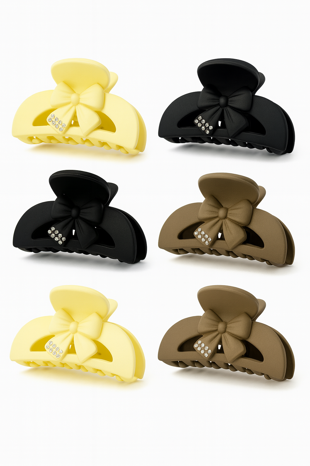 Setul conține 12 clame elegante pentru par, dimensiune 10 cm, decorate cu fundita si pietricele stralucitoare. Fabricate din material durabil, cu textura mata si arc rezistent, aceste clame ofera o prindere ferma si confortabila pe orice tip de par.