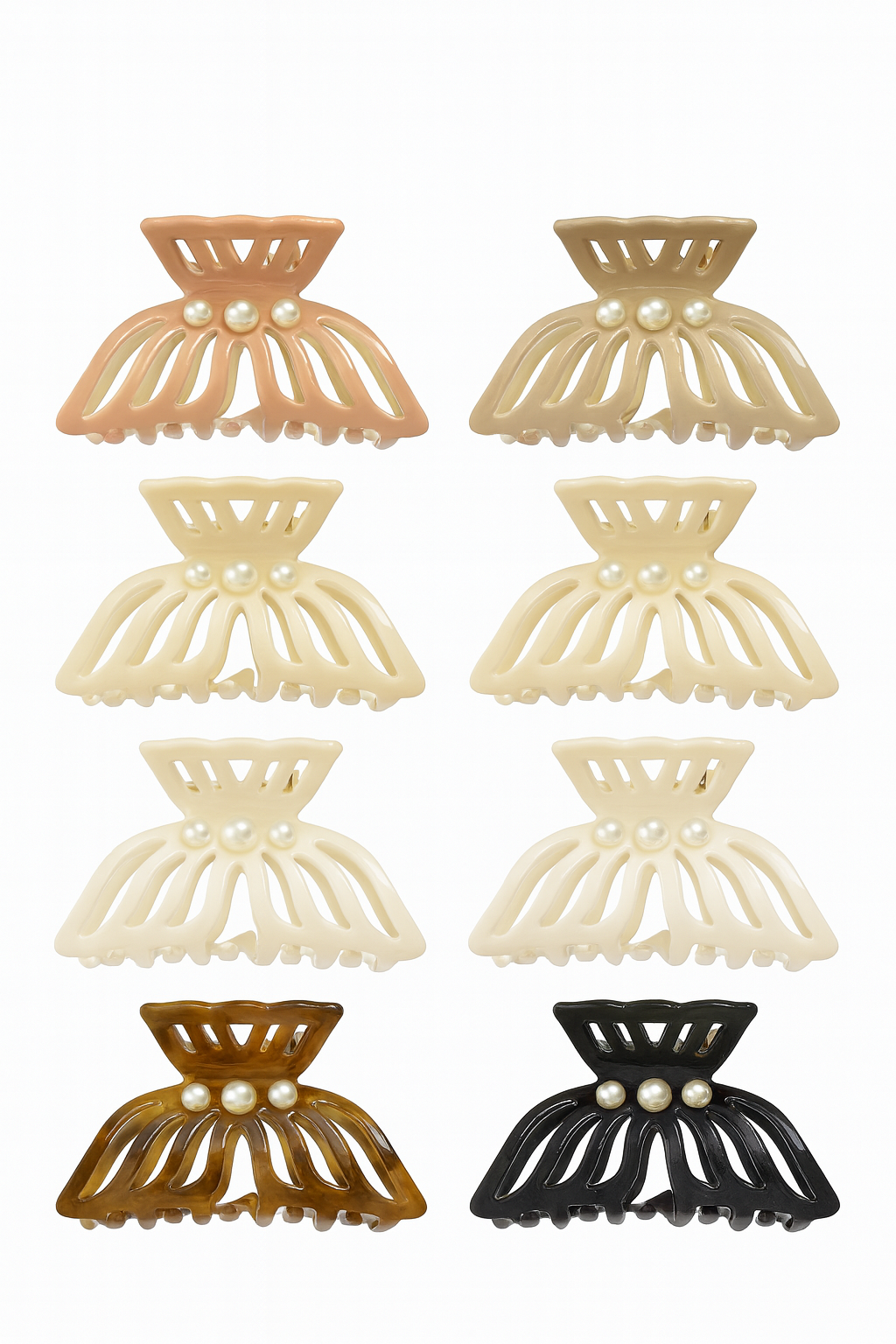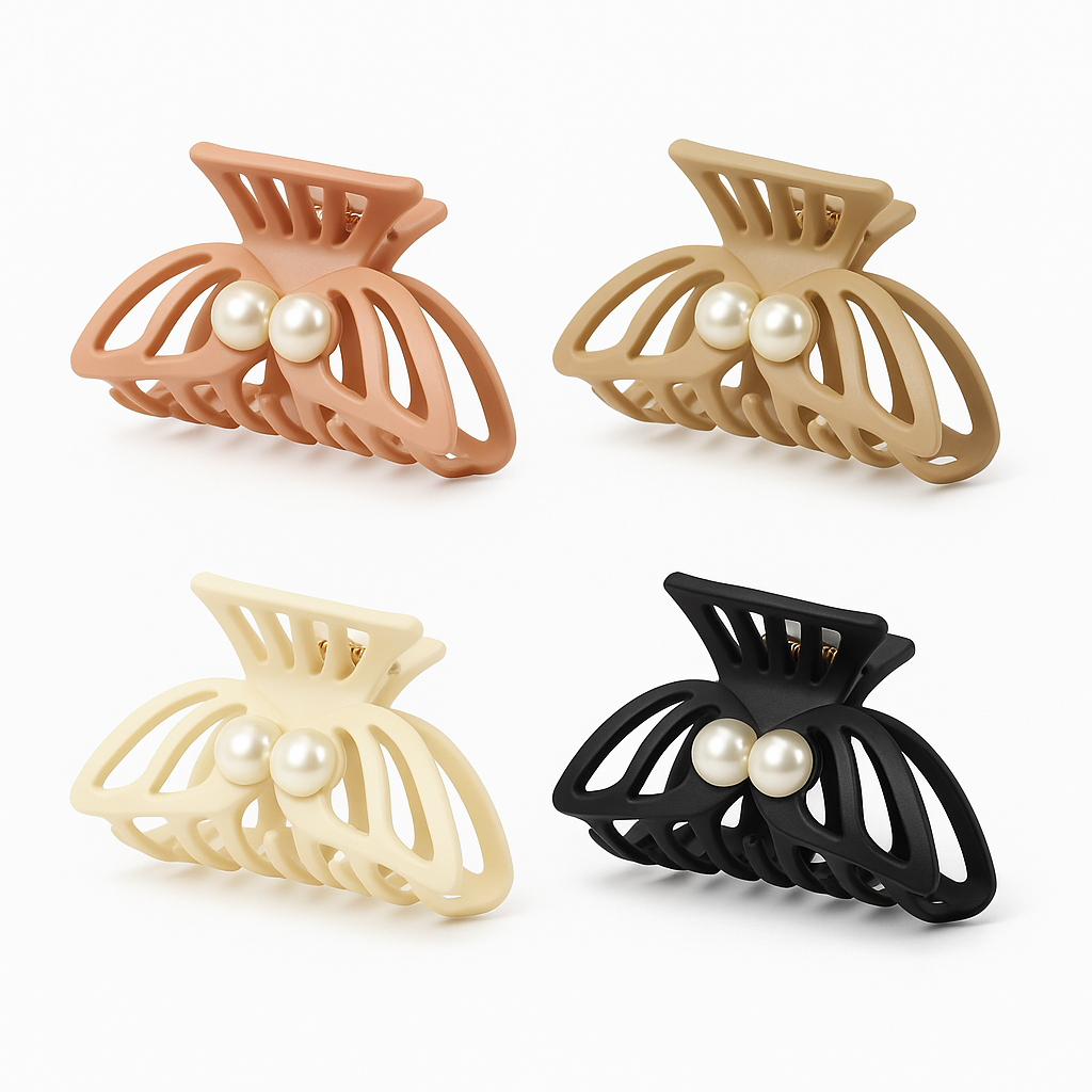 Setul include 12 clame pentru par, dimensiune 10 cm, cu design elegant tip fluture si decor cu perle, ideale pentru un look feminin si rafinat. Sunt fabricate din material rezistent, usor flexibil, cu arc puternic care ofera o prindere sigura, fara alunecare.