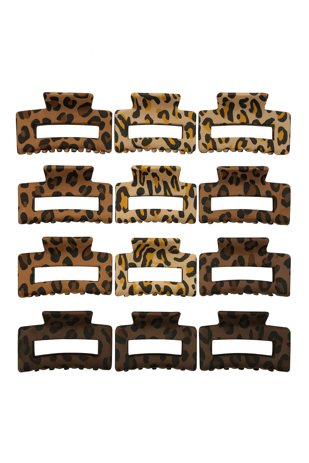 Completeaza colectia ta cu un set de 12 cleme de par de 11 cm, decorate cu imprimeu leopard in nuante variate de maro, bej si auriu. Clemele au un finisaj mat modern si o structura rezistenta ce asigura o prindere ferma, ideala pentru par mediu sau lung.