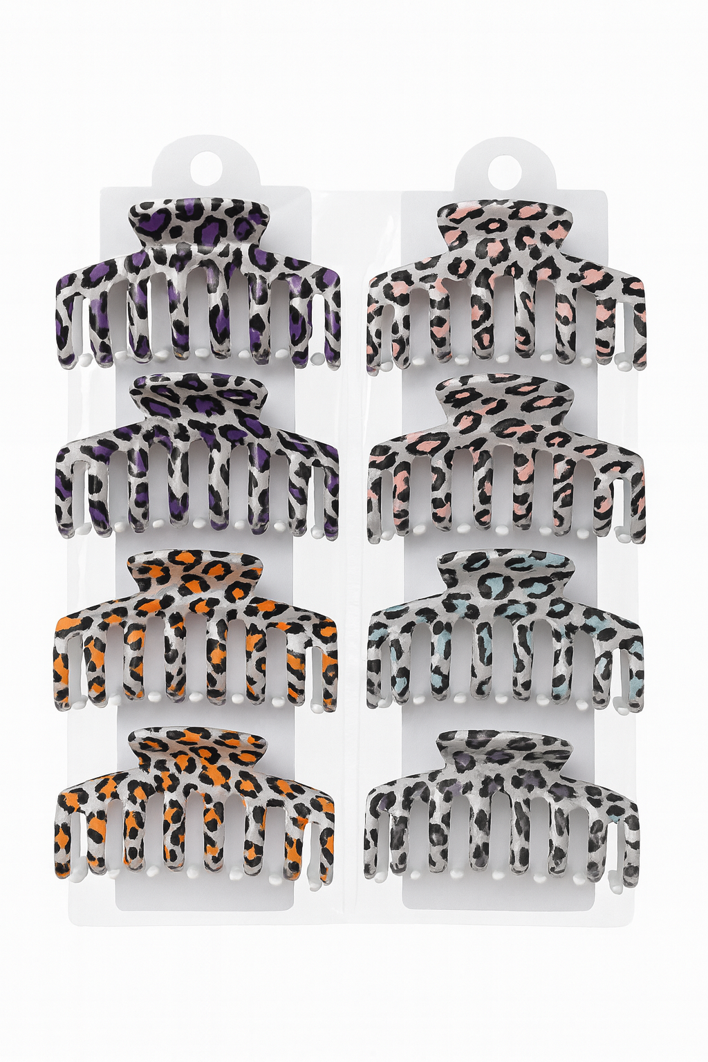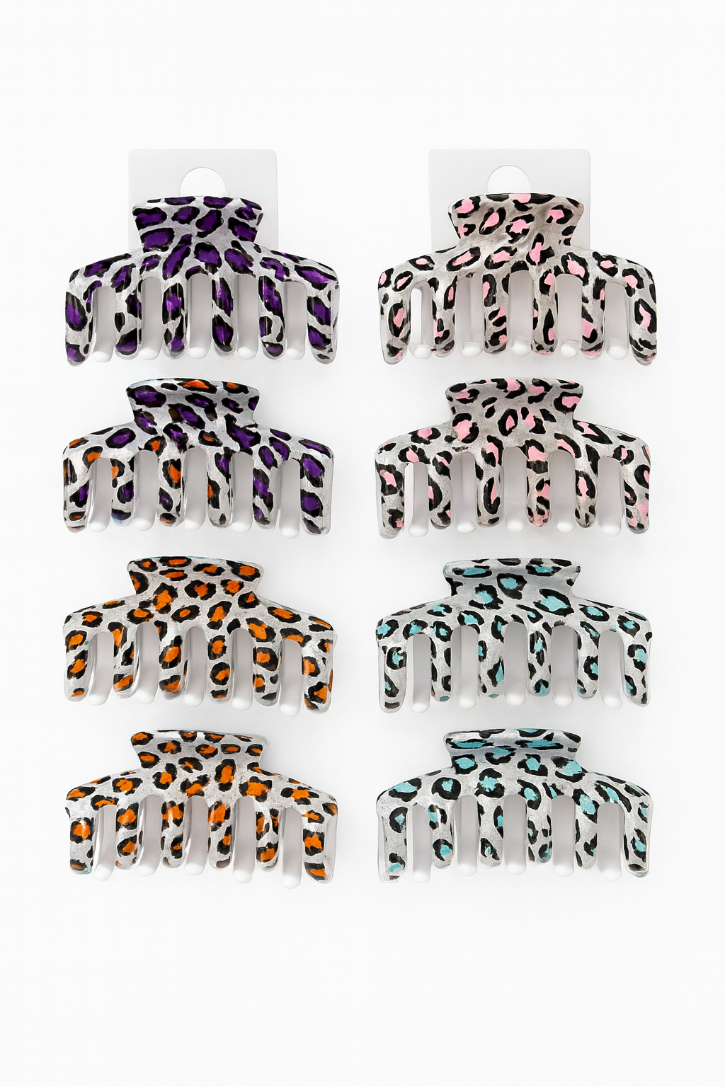 Acest set de 12 cleme de par de 11 cm vine cu imprimeu leopard in culori vibrante: mov, roz, portocaliu si turcoaz. Clemele sunt fabricate din material rezistent, cu prindere ferma si arc puternic, ideale pentru coafuri rapide, practice si stilate.