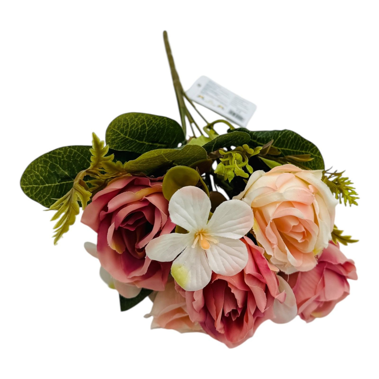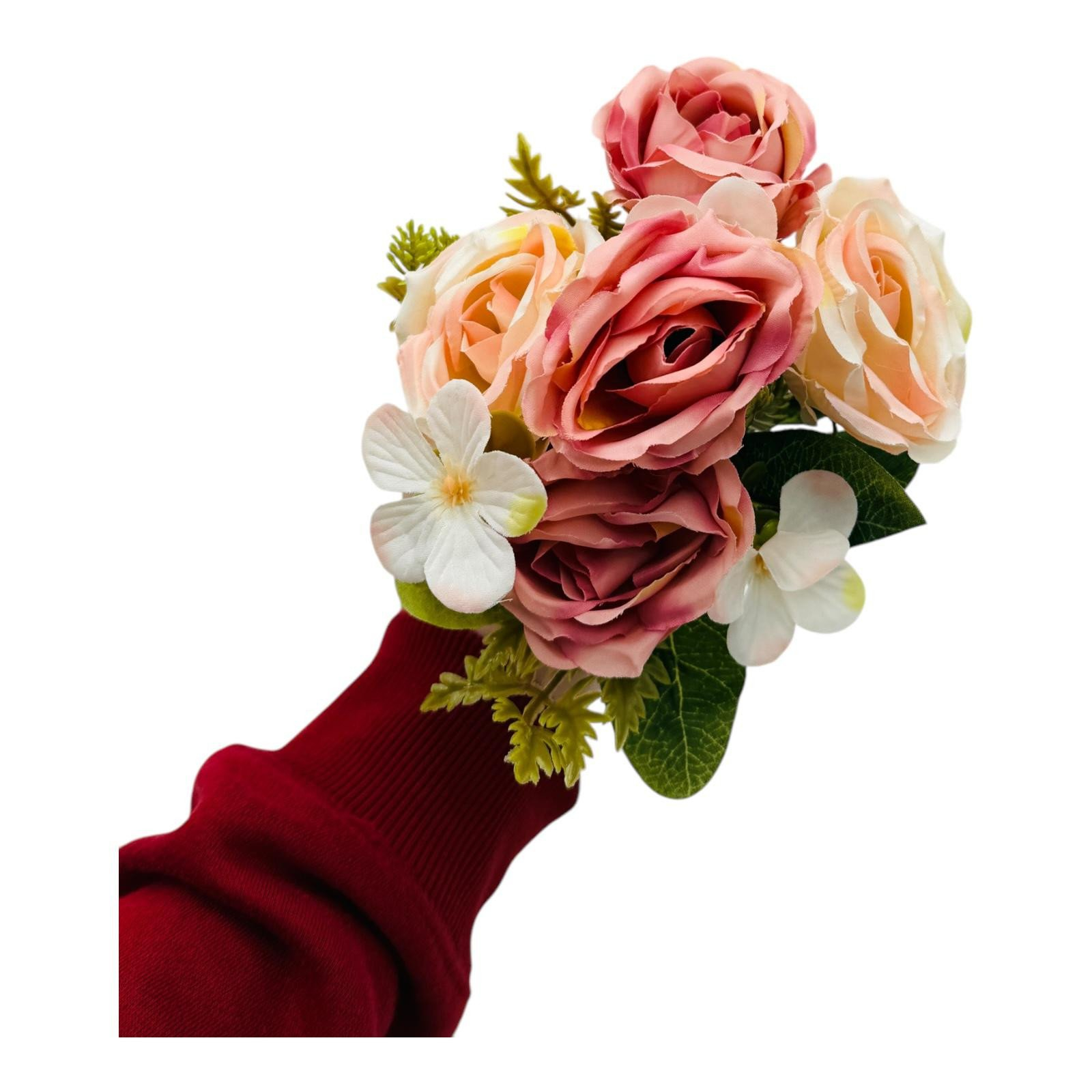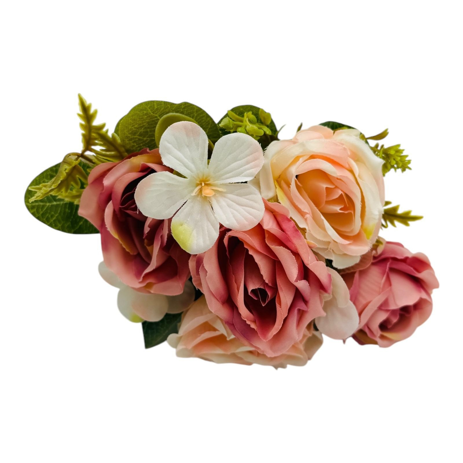 Buchet artificial deosebit, realizat cu 5 bujori delicati si 3 flori de eucalipt, completate cu frunze si boboci pentru un aspect natural si rafinat. Combinatia cromatica de roz si crem ofera un aer elegant si romantic, perfect pentru decoratiuni interioare, nunti sau evenimente speciale. Cu o lungime de 29 cm si o calitate superioara, acest buchet artificial impresioneaza prin detalii realiste si durabilitate.Disponibil , este ideal pentru florarii, designeri de evenimente sau pasionatii de decoratiuni care cauta produse premium. Fara grija pentru intretinere, acest buchet ramane mereu frumos, fiind o alegere practica si estetica. Adauga un strop de eleganta spatiului tau sau ofera-l drept cadou celor dragi!