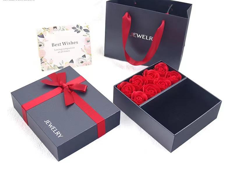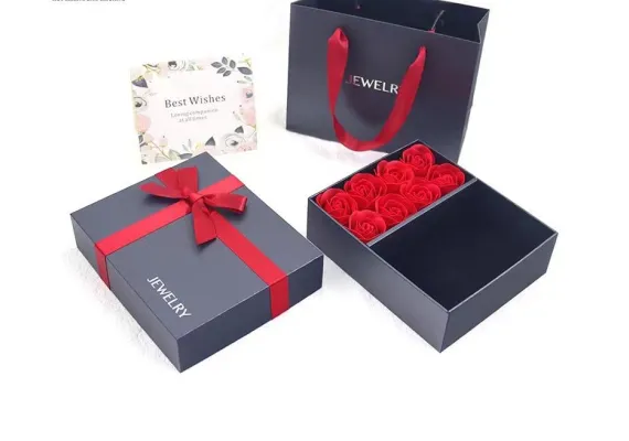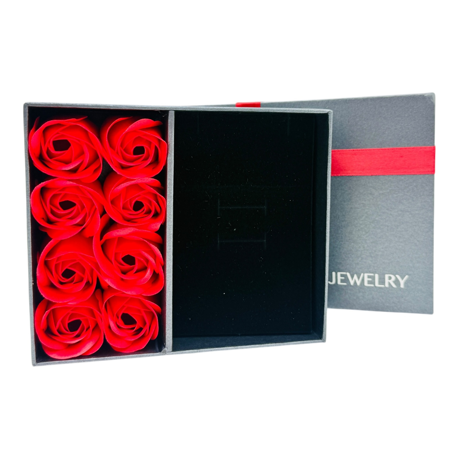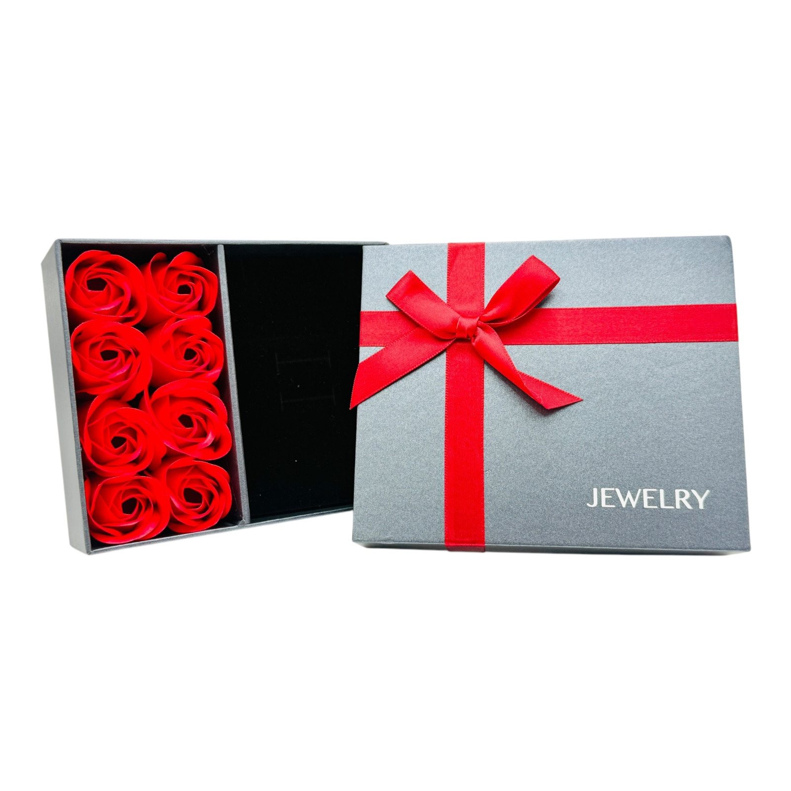 Set Cadou Elegant „Jewelry” – Simplu, rafinat si plin de semnificatieAcest set este perfect pentru ocazii speciale, oferind un design elegant si un mesaj subtil de apreciere:Contine 9 trandafiri de sapun in culoarea rosie, aranjati cu grija intr-un compartiment dedicat. Trandafirii simbolizeaza iubirea si frumusetea, facandu-l ideal pentru cadouri romantice.Un compartiment gol special, conceput pentru a adauga bijuterii sau alte cadouri personalizate, ceea ce ofera posibilitatea de a-l transforma intr-un dar unic.Cutia are un design modern si minimalist, cu un fundal gri metalic, accesorizat cu o funda rosie si text „Jewelry” imprimat, ce adauga o nota premium.Ambalajul este conceput pentru a impresiona prin simplitate si eleganta, fiind usor de oferit si gata sa fie daruit imediat.Acest set este perfect pentru aniversari, zile de nastere sau alte ocazii speciale, oferind o experienta sofisticata si memorabila.