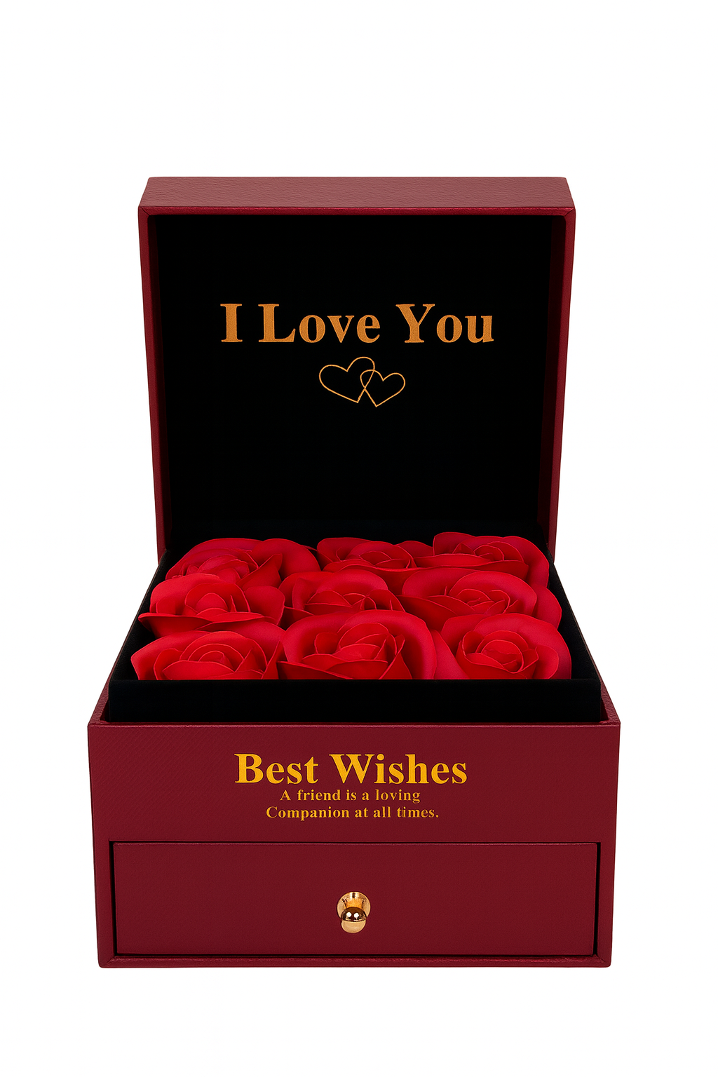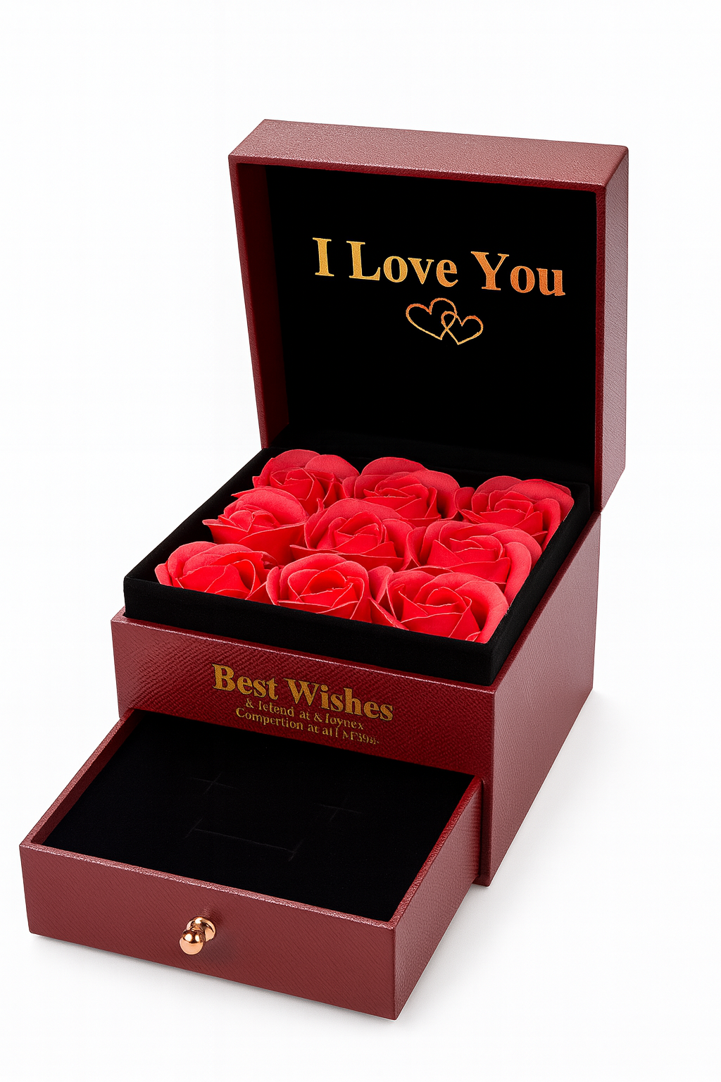 Aceasta cutie cadou eleganta, in nuanta rafinata de bordo, cu 9 trandafiri de sapun rosii, este alegerea ideala pentru un cadou romantic, sofisticat si memorabil. Designul clasic cu accente aurii si mesajul „I Love You” transforma acest produs intr-o declaratie de iubire perfecta pentru orice ocazie speciala.