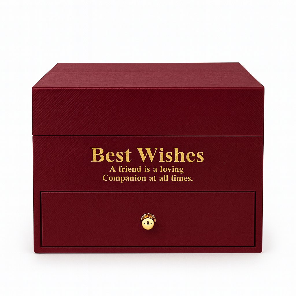 Cutia este prevazuta cu un sertar inferior practic, ideal pentru depozitarea bijuteriilor, banilor, unui mesaj personalizat sau a altor mici surprize. Interiorul negru contrasteaza elegant cu exteriorul bordo, oferind un efect vizual premium.