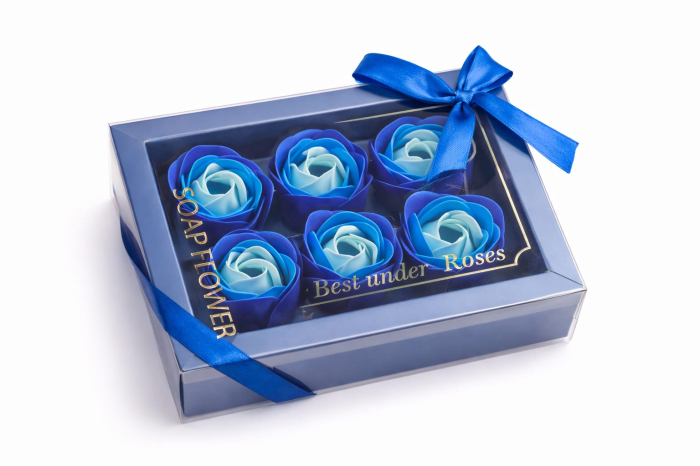 Cutie cadou cu 6 trandafiri din spuma 14.5x10x5.5 cm albastra, cadou primavara
