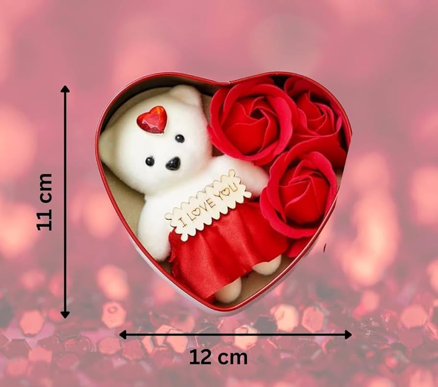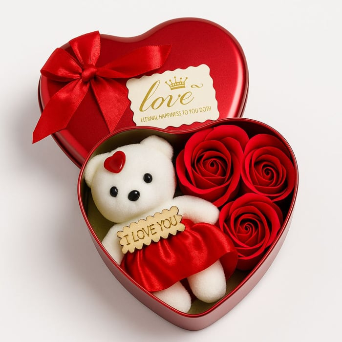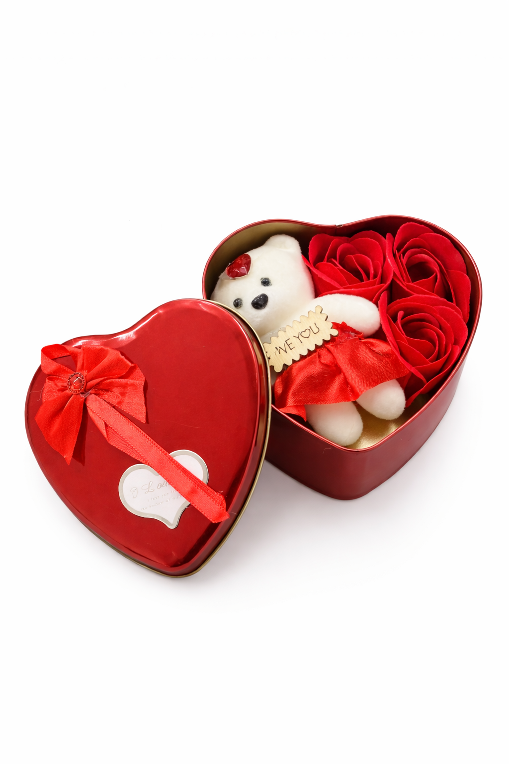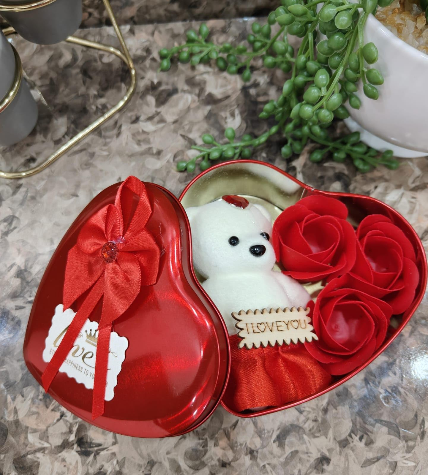 Cutia cadou in forma de inima cu trandafiri din sapun si urs de plus este un cadou romantic si elegant, ideal pentru a surprinde persoana iubita cu un gest special. Produsul este realizat intr-o cutie metalica decorativa, in forma de inima, de culoare rosie, cu capac detasabil si panglica decorativa.