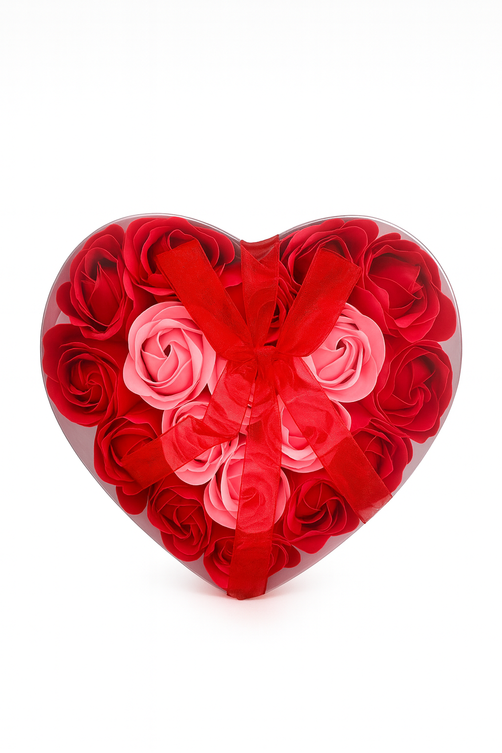 Cutie Inima cu 24 Trandafiri din Sapun Rosu-Roz, Aranjament Luxury Cadou 17x17 cm