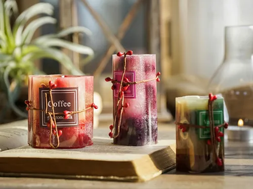 Lumanarile parfumate pillar cu look vintage aduc caldura si stil in orice incapere. Fiecare piesa are ceara colorata in straturi pentru un efect vizual bogat si este accesorizata cu snur rustic cu boabe decorative. Setul include trei dimensiuni complementare si arome populare (cafea, fructe de padure, vanilie), ideale pentru living, cafenea, receptie sau vitrine de sezon.