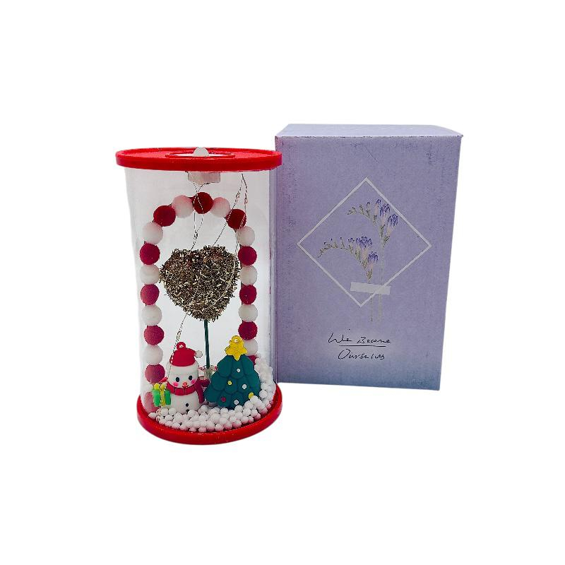 Mini scenă festivă sub cupolă de sticlă: om de zăpadă, brăduț și inimă sclipitoare. Iluminare LED pentru efect cald, gata de oferit cadou (cutie inclusă).