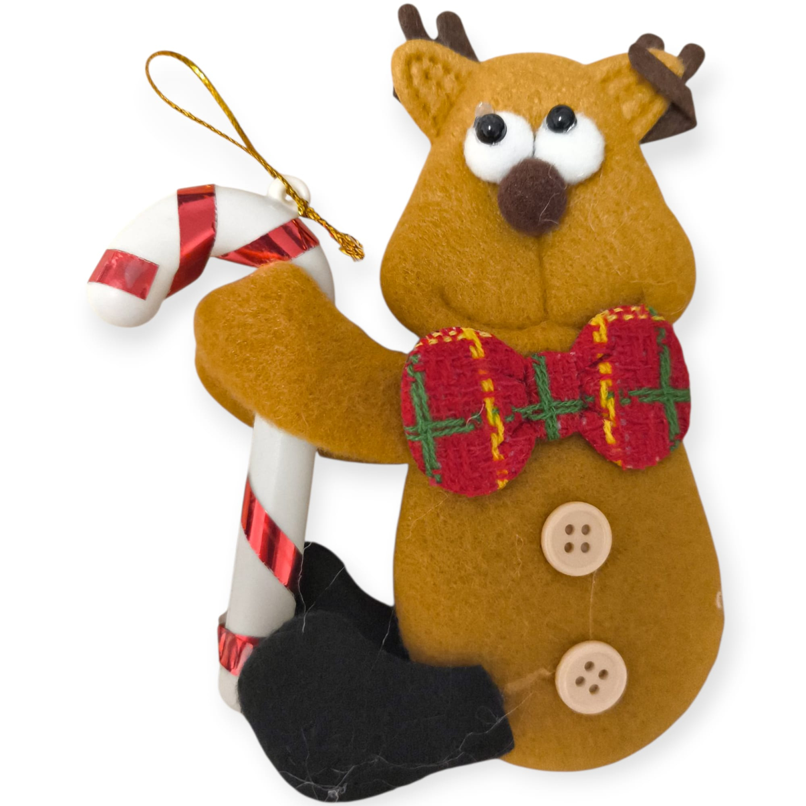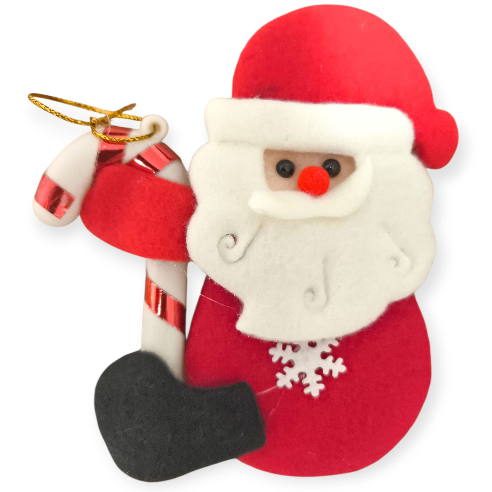 Ornamente ușoare pentru brad și decor, din material textil cu motive de sezon: Moș Crăciun, om de zăpadă, ren și steluțe.