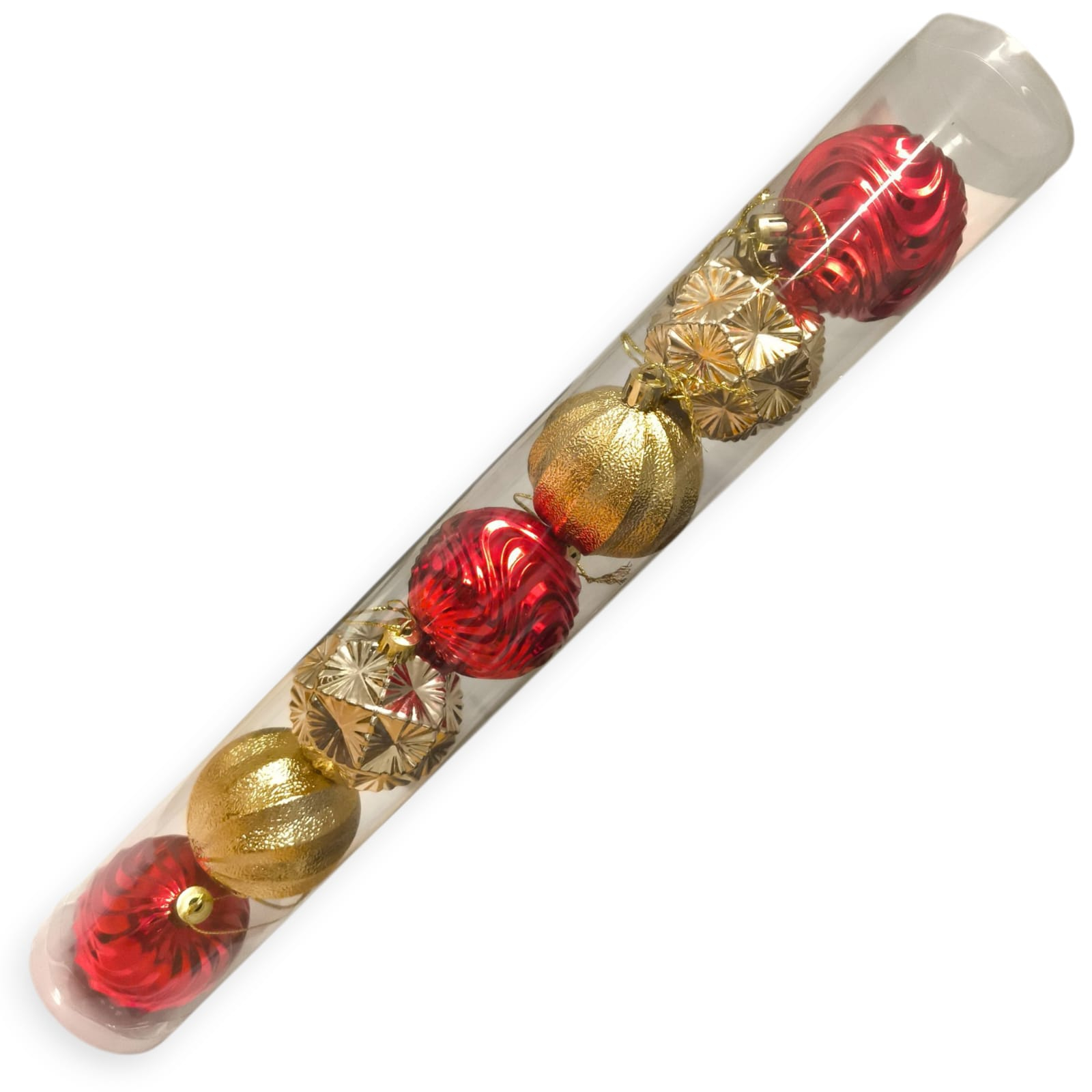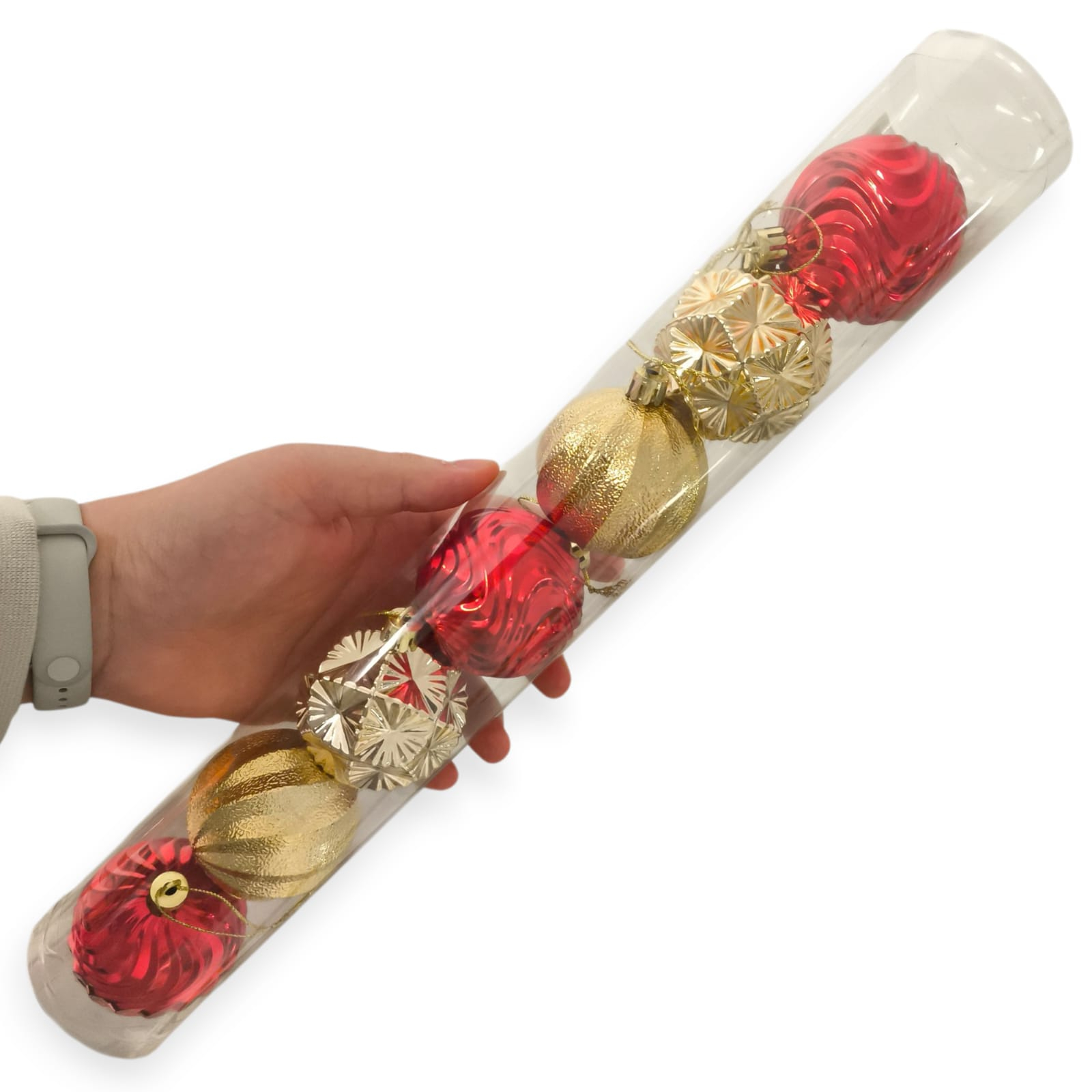 Set 7 globuri de Craciun pentru brad – 40x6x6cm, nuanta rosu+ auriu, finisaj mat/lucios/sclipici