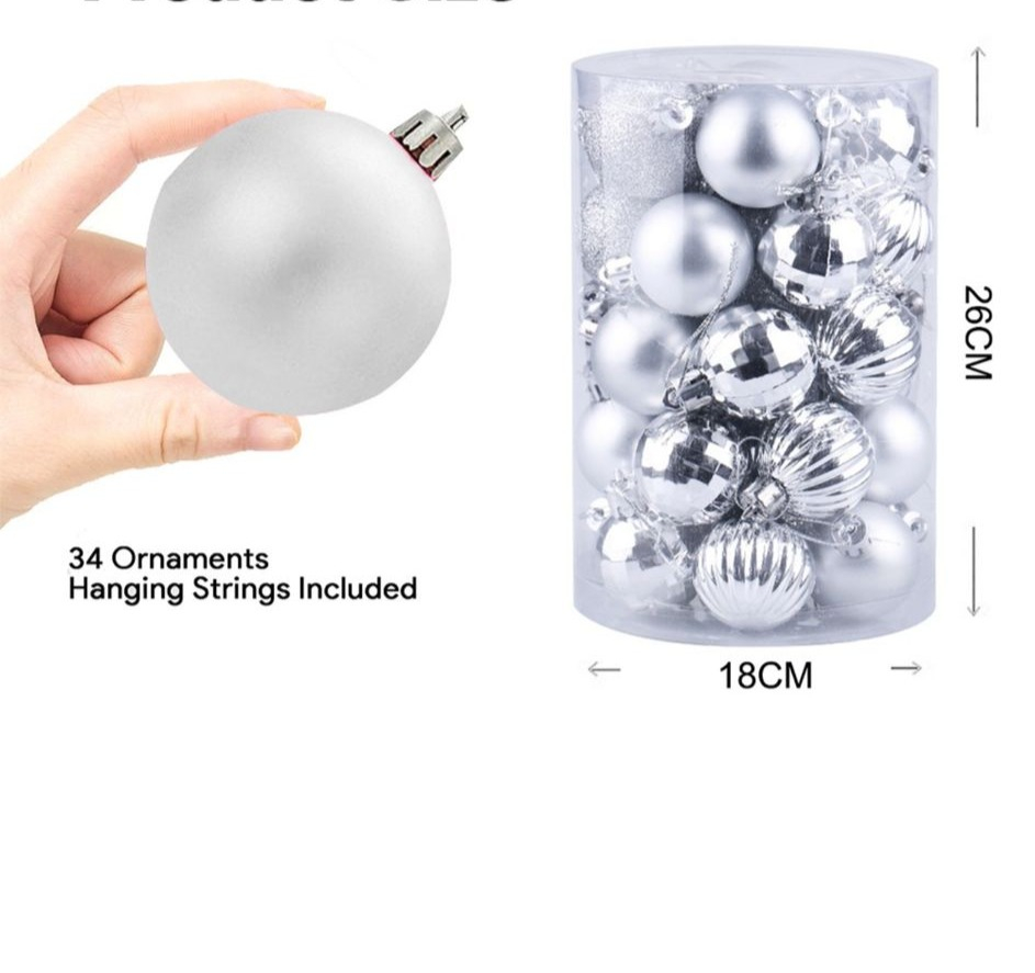 Set 34 globuri de Craciun pentru brad – 26x18x18cm, nuanta argintiu, finisaj lucios/satinat/ sclipici