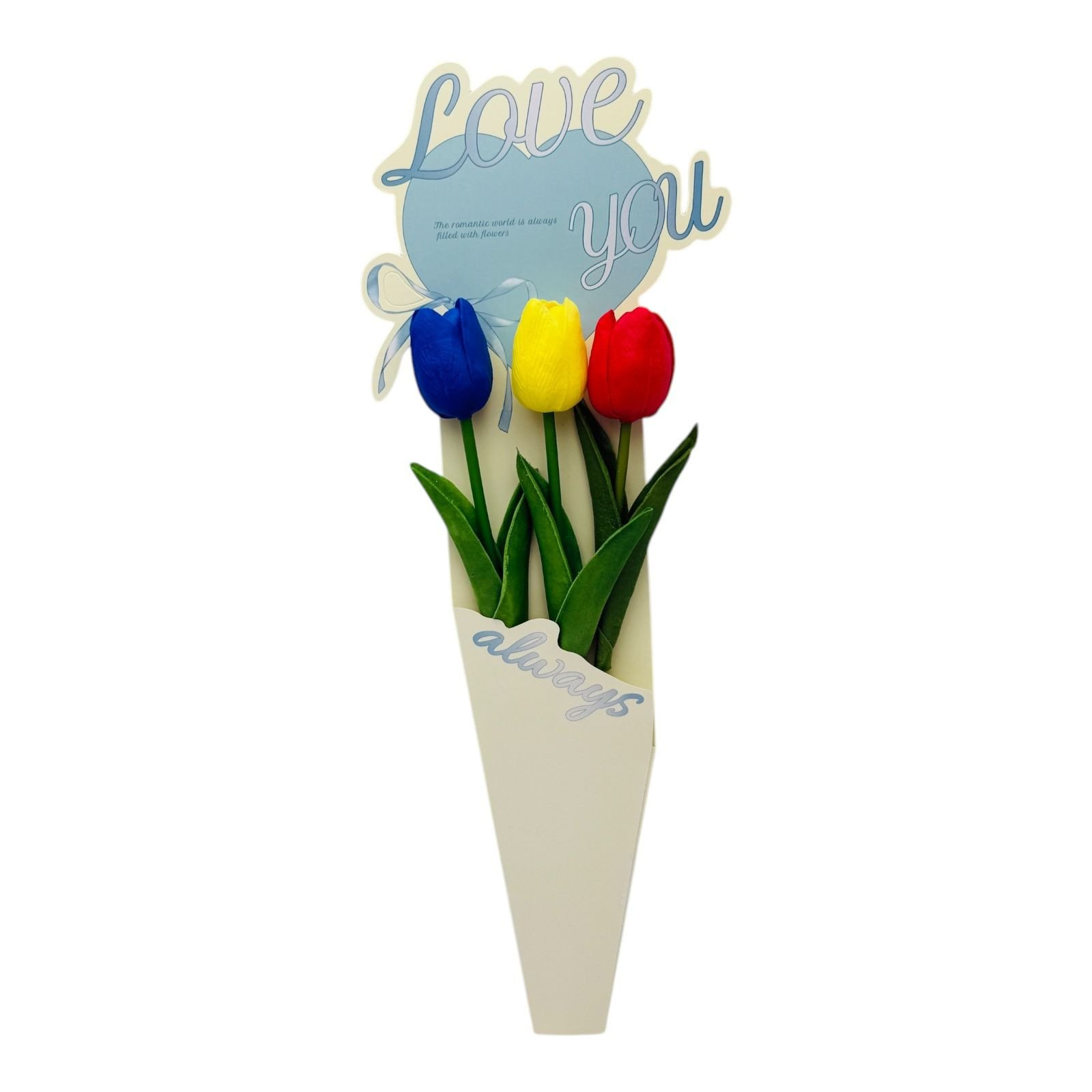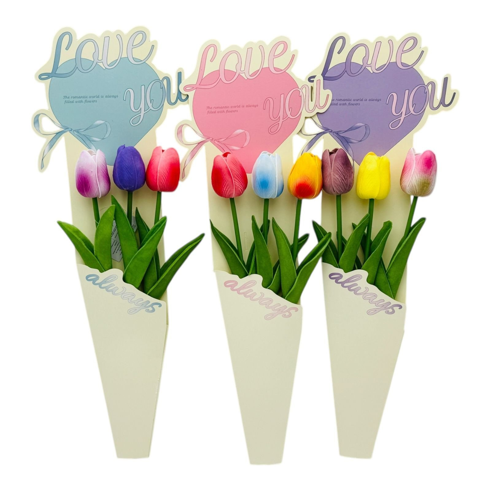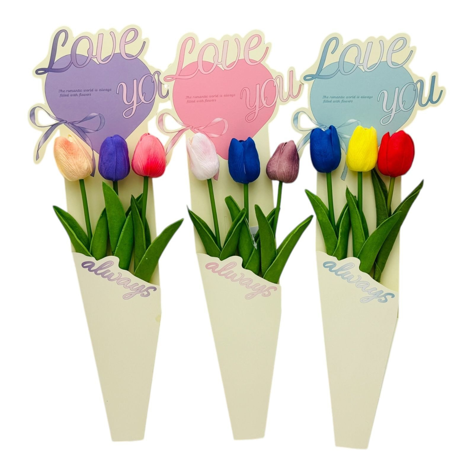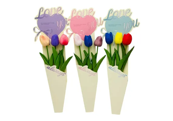 Aranjament Deosebit cu 3 Lalele din Silicon Soft Touch – 45 cm, Disponibil Adăugați un strop de primăvară oricărui decor cu acest aranjament elegant format din trei lalele din silicon "soft touch". Florile sunt realizate cu o atenție deosebită la detalii, oferind un aspect și o textură autentică, similară cu cea a lalelelor naturale. Disponibile în culori vibrante și diverse combinații, acest set este ideal pentru a aduce o notă de prospețime și stil în orice încăpere.Fiecare aranjament are o lungime de 45 cm și este însoțit de un ambalaj delicat cu mesaj de dragoste, ceea ce îl face perfect pentru cadouri sau pentru a înfrumuseța orice eveniment sau locație.Caracteristici:Material: Silicon de înaltă calitate (soft touch)Înălțime: 45 cmCulori variate: roz, albastru, alb, galben, roșu, violetAmbalaj modern cu mesaj „Love You”Avantaje:Textură realistă și aspect naturalIdeal pentru decoruri interioare sau evenimente specialeRezistent în timp, fără necesitatea întrețineriiDisponibilitate : Perfect pentru florării, decoratori și organizatori de evenimente. Aduceți eleganța și frumusețea lalelelor în proiectele dvs. cu acest aranjament de calitate superioară!