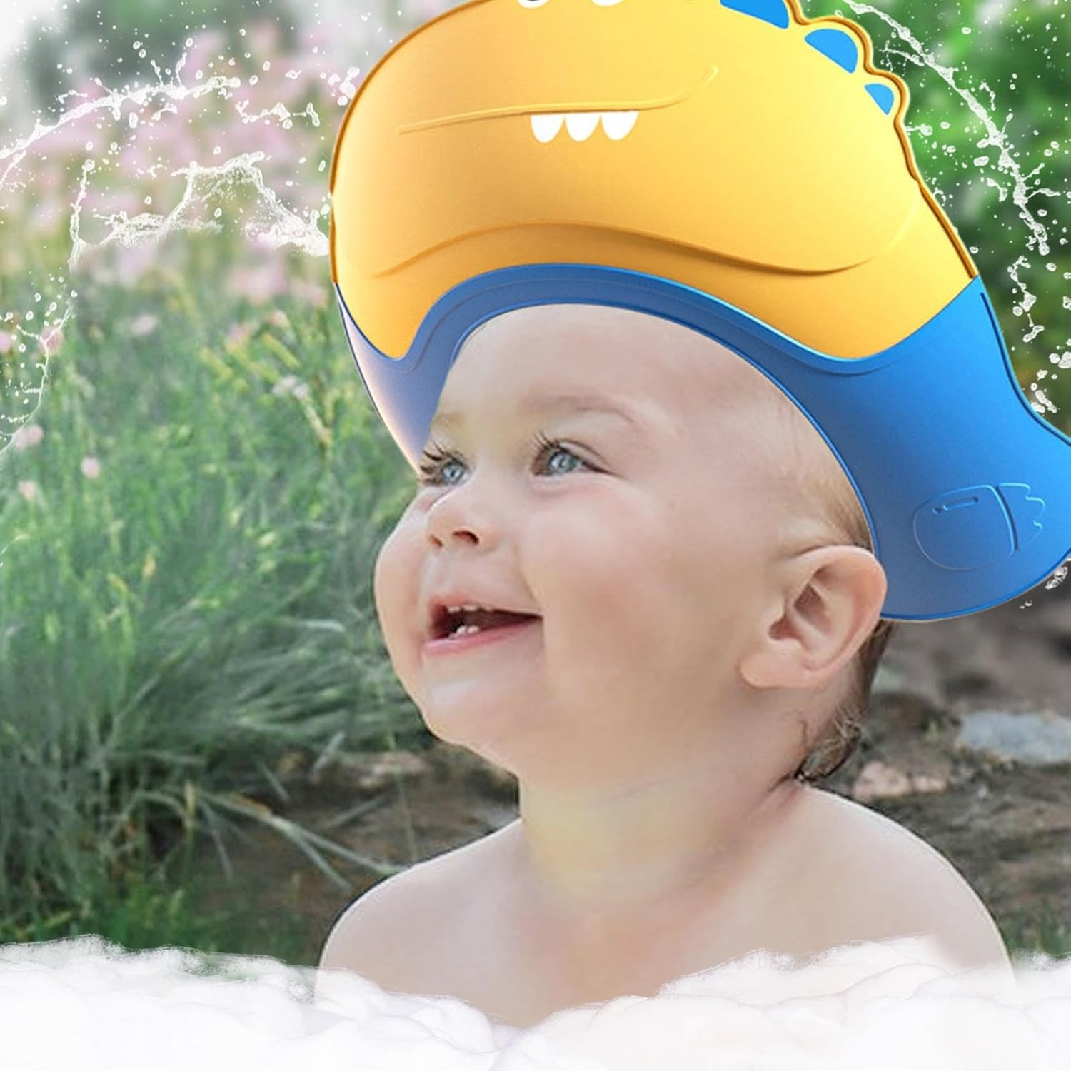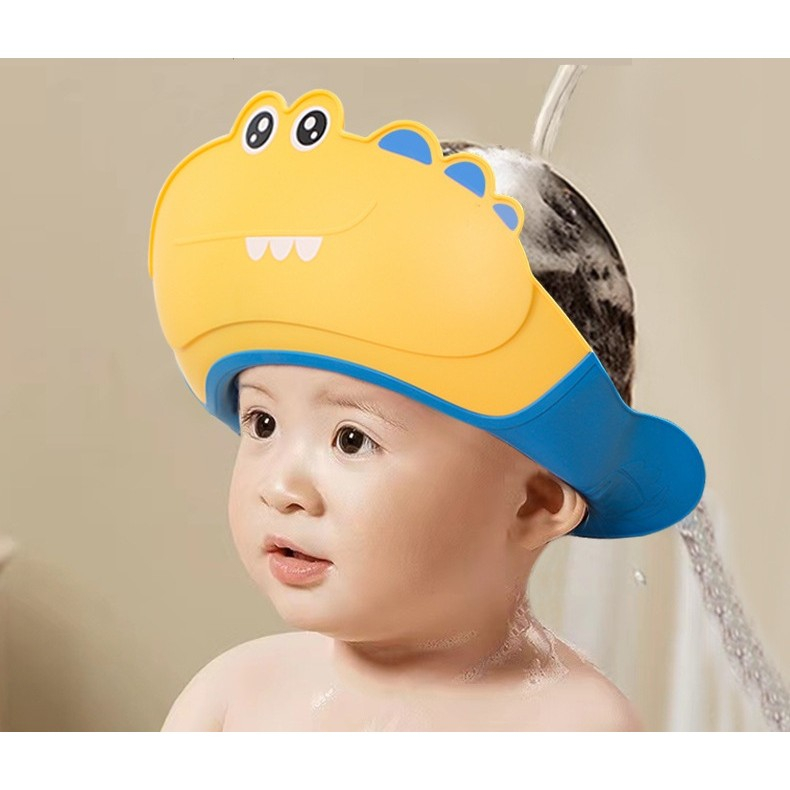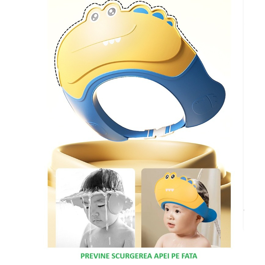 Casca de Dus, , Previne Scurgerea Apei si Samponului pe Fata, 0-12 Ani, Ajustabila, din TPE+PP, 20 x 23 cm, Model Crocodil, Galben/Albastru