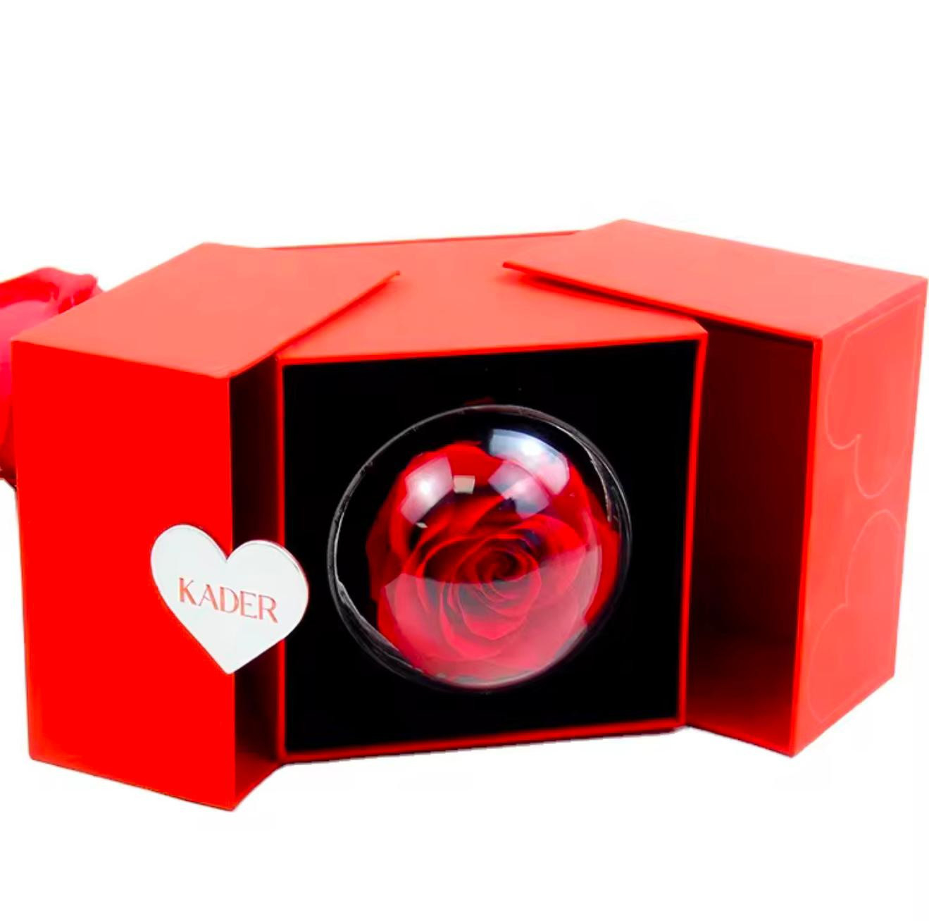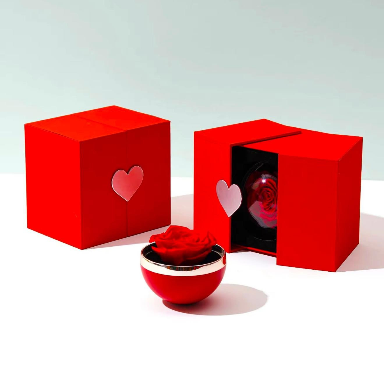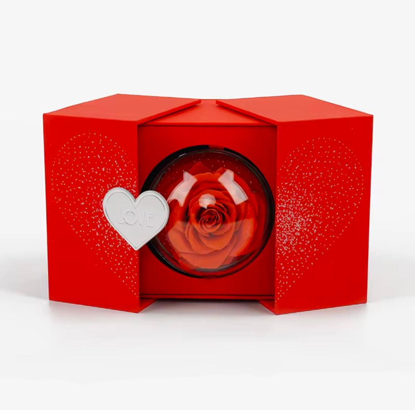 Caseta decorativă de lux în nuanțe vibrante de roșu este o alegere perfectă pentru un cadou memorabil. Acest produs se remarcă printr-un design compact (13×12.5×10 cm) și elegant, care combină estetica rafinată cu funcționalitatea.Caseta include un trandafir criogenat de o frumusețe atemporală, păstrat sub o cupolă transparentă, care oferă protecție și pune în valoare delicatețea florii. Procesul de criogenare permite ca acest trandafir să își păstreze aspectul proaspăt timp îndelungat, fără a necesita întreținere specială.Ambalajul este rafinat, decorat cu detalii simbolice precum o inimă strălucitoare, ceea ce subliniază tematica romantică a produsului. Designul compact și modern permite utilizarea casetei atât ca element decorativ, cât și ca spațiu pentru păstrarea micilor accesorii sau bijuterii.Acest produs este ideal pentru diverse ocazii speciale, cum ar fi aniversările, zilele de naștere, Valentine’s Day sau alte momente în care dorim să transmitem emoții și să lăsăm o impresie de neuitat."