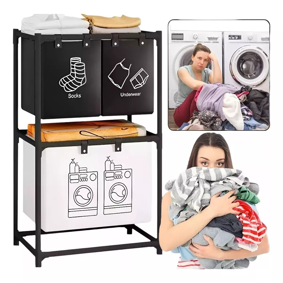 Informatii utile: Numar compartimente:3, Functii:Depozitare, Material:Otel Textil, Tip produs:Cos de rufe, Greutate:1.2 kg, Inaltime:97 cm, Lungime:57 cm, Latime:28 cm, Culoare:Negru