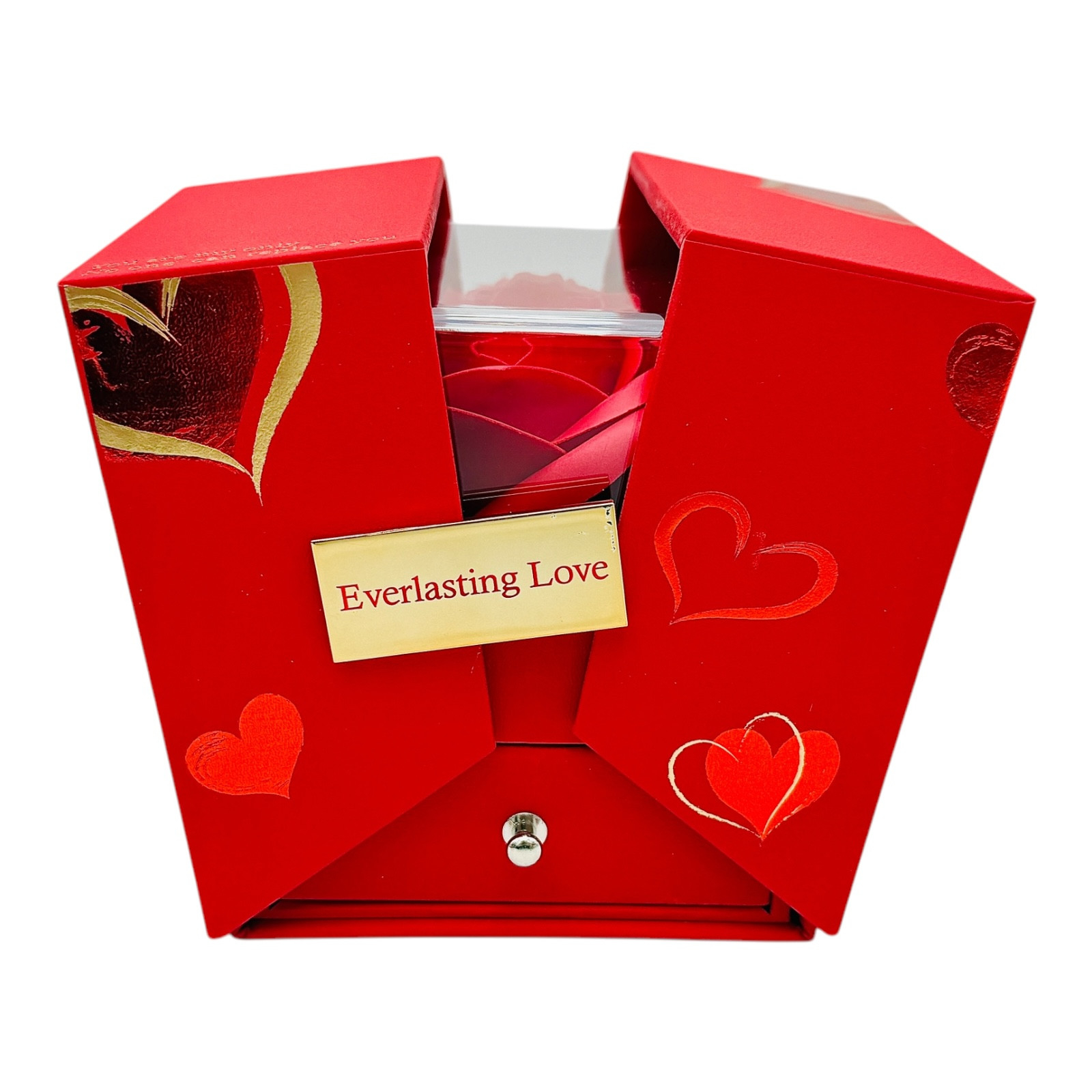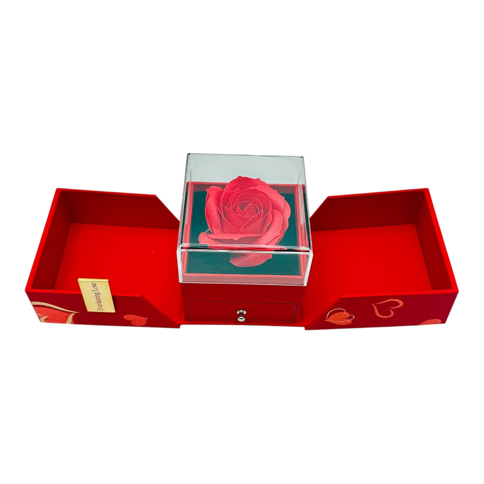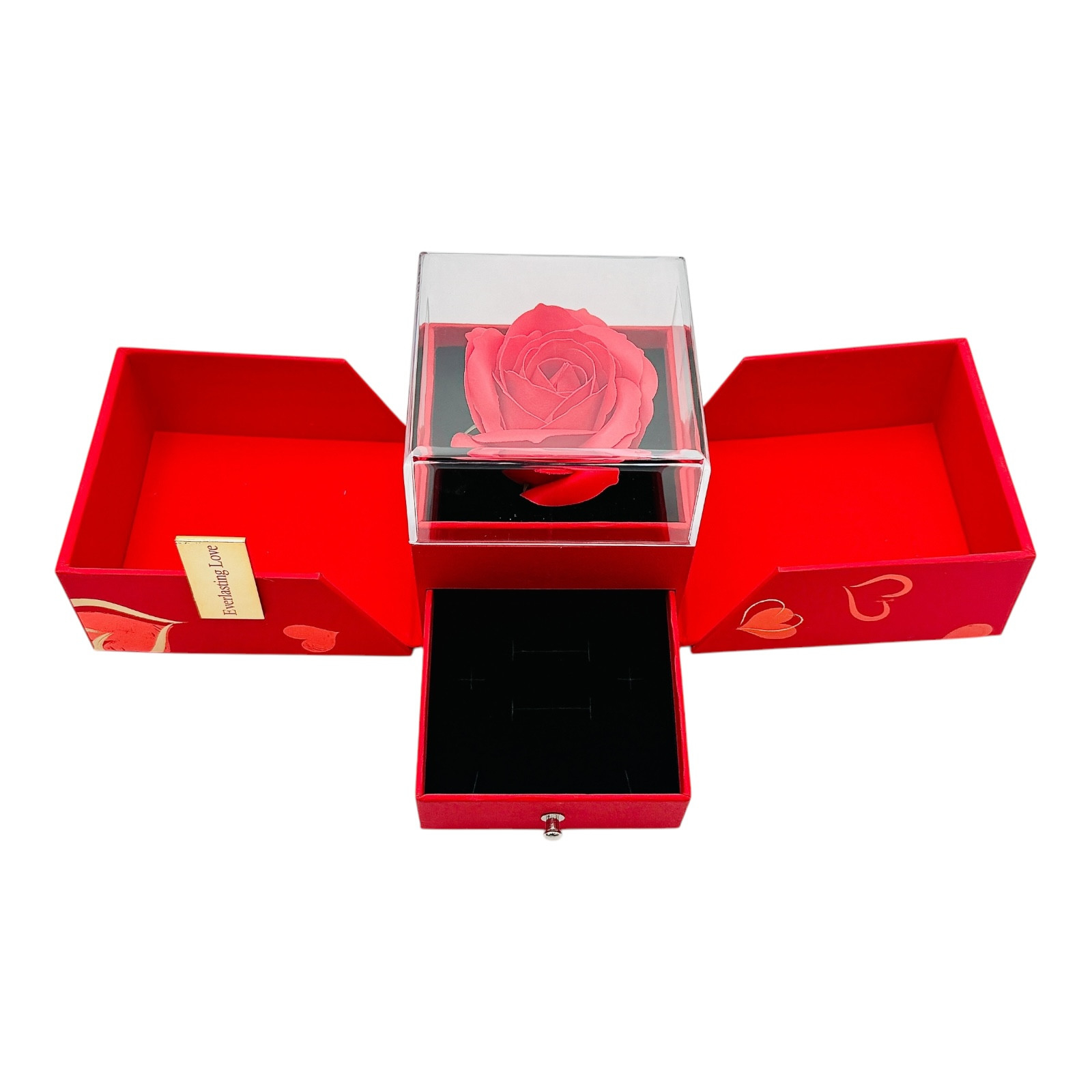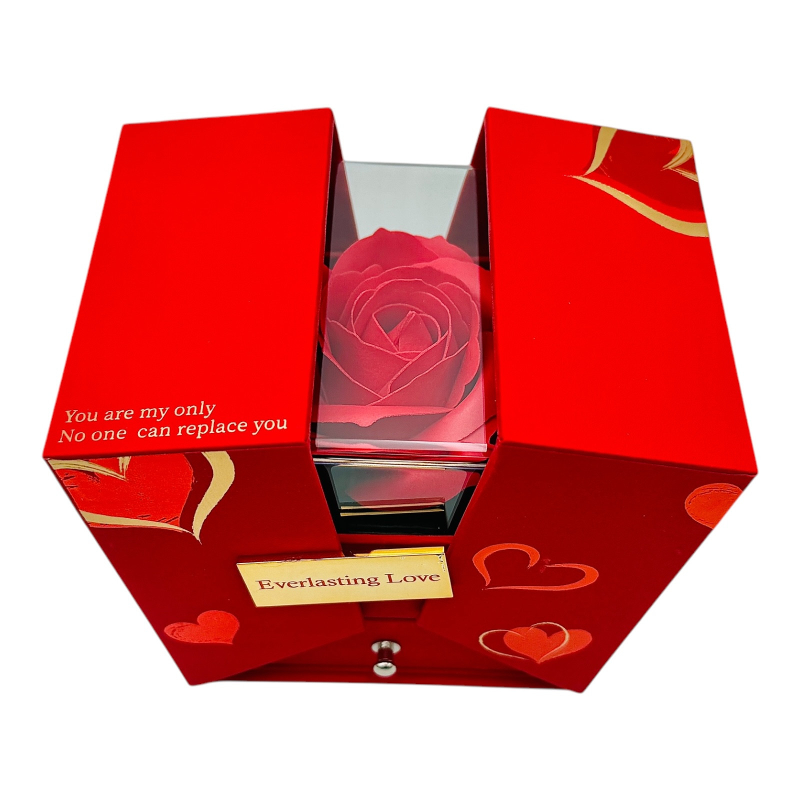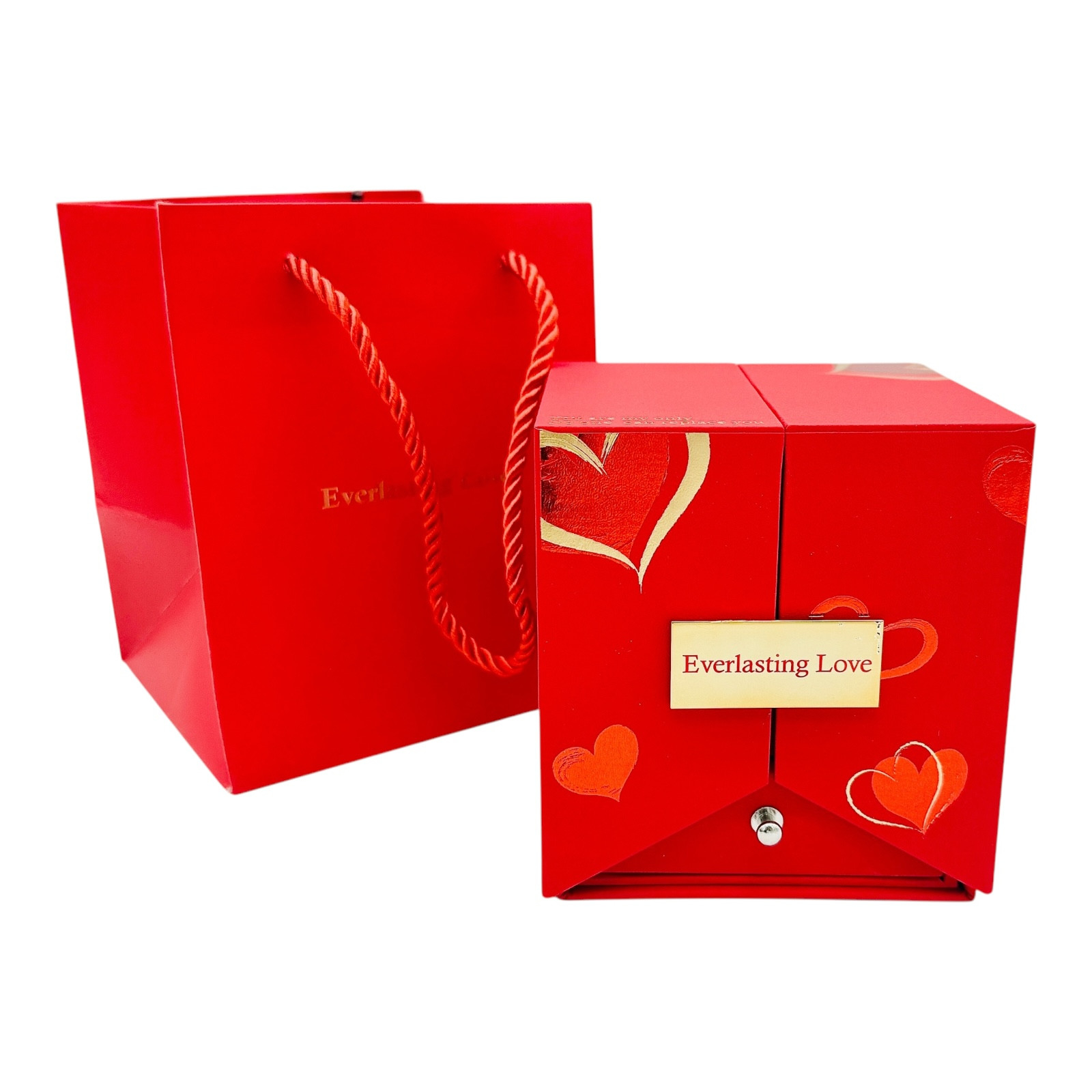 Cutia cadou premium cu trandafir de săpun și compartimente multifuncționale este un produs exclusivist, conceput pentru a impresiona prin designul său rafinat și utilitatea sa versatilă. Trandafirul parfumat, realizat din săpun de înaltă calitate, este așezat cu eleganță sub un capac transparent, punându-l în evidență și adăugând un aer sofisticat întregului aranjament.Cutia este realizată din materiale de calitate superioară, având un finisaj elegant și detalii decorative romantice, precum inimioarele imprimate. Structura sa inteligentă include mai multe compartimente care se deschid armonios, fiind ideale pentru a adăuga mici cadouri suplimentare, bijuterii sau alte accesorii. În plus, cutia dispune de un sertar inferior bine organizat, perfect pentru surprize suplimentare.Dimensiunile compacte și designul premium fac acest produs ideal pentru ocazii speciale precum aniversări, zile de naștere, Valentine’s Day sau orice alt moment în care se dorește oferirea unui cadou memorabil. Produsul vine însoțit de o pungă de cadou asortată, care adaugă un plus de comoditate și eleganță prezentării, fiind gata de oferit imediat.Perfect pentru vânzare , acest aranjament este o alegere excelentă pentru comercianții care își doresc să ofere clienților un produs unic, elegant și practic, ce emană rafinament și emoție.