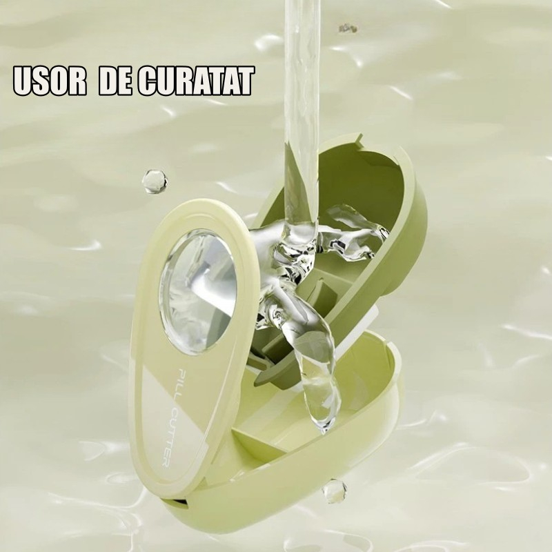 Lama este integrata in capac si este pozitionata strategic pentru a facilita taierea eficienta. Capacul transparent permite vizualizarea pastilei in timpul procesului, oferind control si reducand riscul unei sectionari gresite. Dupa utilizare, cutia poate fi curatata cu usurinta sub jet de apa, ceea ce contribuie la mentinerea igienei. Acest detaliu este important mai ales pentru cei care folosesc produsul in mod frecvent sau pentru mai multe tipuri de pastile.