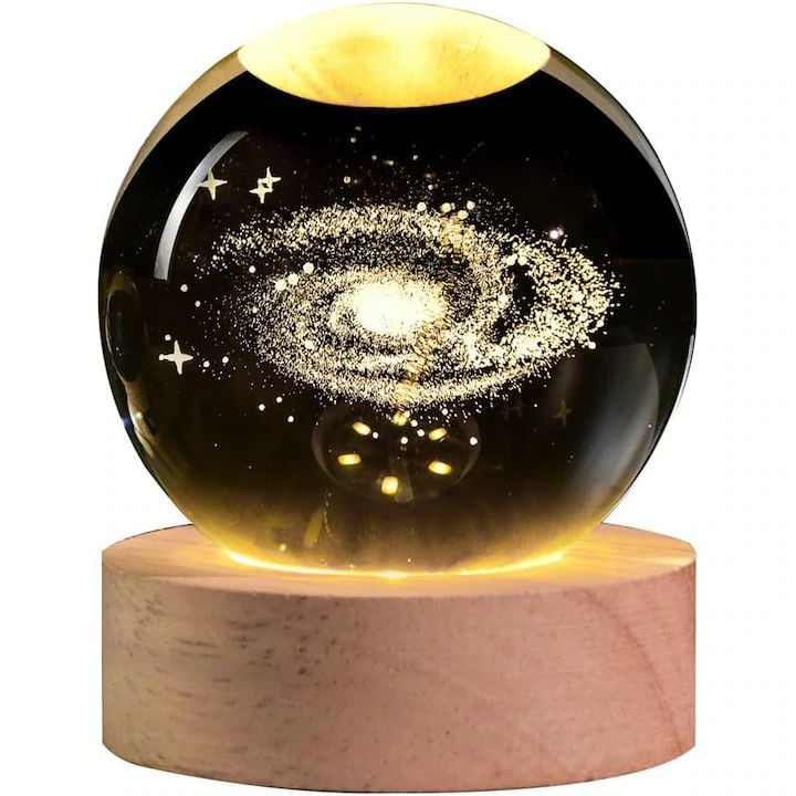 Adauga un strop de magie cosmica in casa ta cu aceasta lampa de veghe 3D cu galaxie, gravata cu precizie in interiorul unui glob din cristal optic de inalta calitate. Cu un diametru de 6cm si o lumina ambientala calda, aceasta lampa creeaza o atmosfera linistitoare si spectaculoasa in acelasi timp, perfecta pentru dormitor, birou sau zona de relaxare.Baza eleganta din lemn natural ofera stabilitate si un contrast vizual placut, punand in valoare frumusetea galaxiei 3D iluminata din interior. Fie ca esti pasionat de astronomie, iubitor de decoruri unice sau pur si simplu cauti un cadou special, aceasta lampa cu galaxie este alegerea perfecta. Design compact si rafinat, ideala pentru meditatie, lectura, atmosfera romantica sau decor inspirational. Un cadou original si elegant pentru orice ocazie – transforma intunericul intr-o calatorie printre stele!