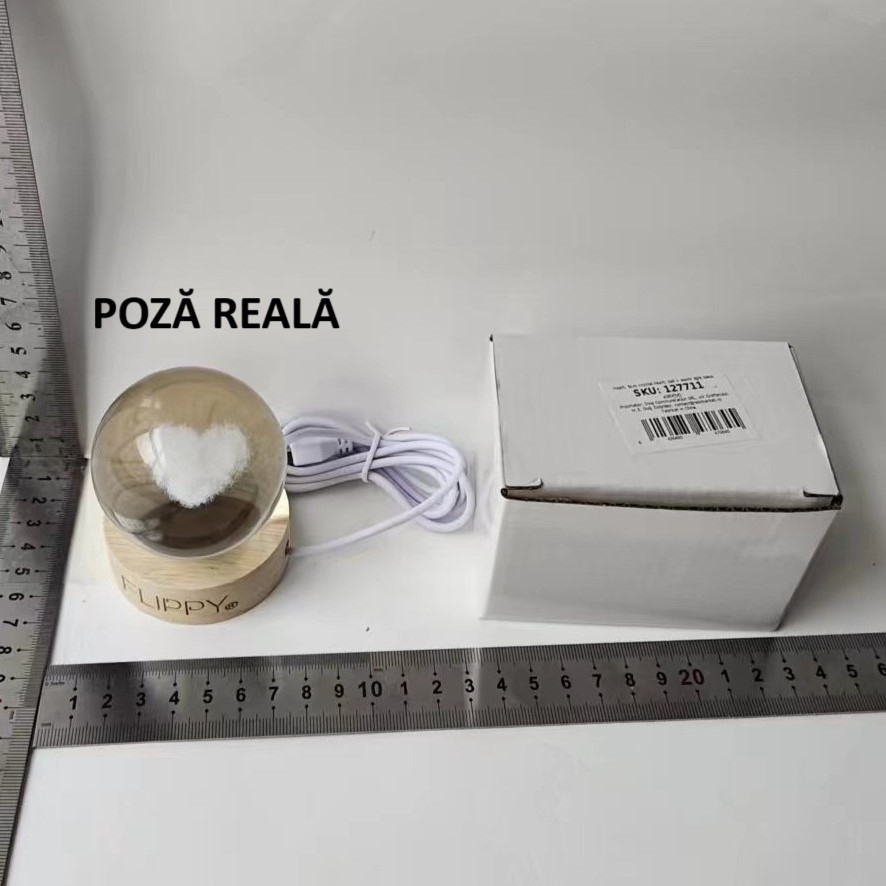 Lampa LED Decorativa, Flippy, cu Bila de Cristal cu Diametru 6cm, Model Inima 3D, Alimentare USB, Suport din Lemn, Lumina Alb Cald