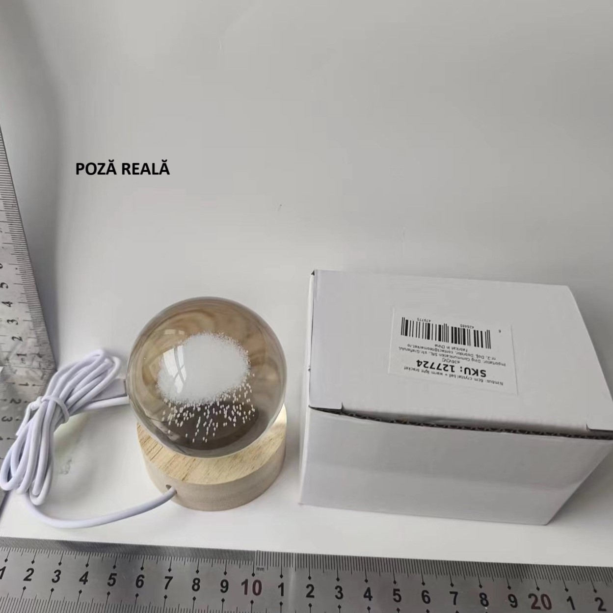 Lampa LED Decorativa, Flippy, cu Bila de Cristal cu Diametru 6cm, Model Nor Ploios 3D, Alimentare USB, Suport din Lemn, Lumina Alb Cald