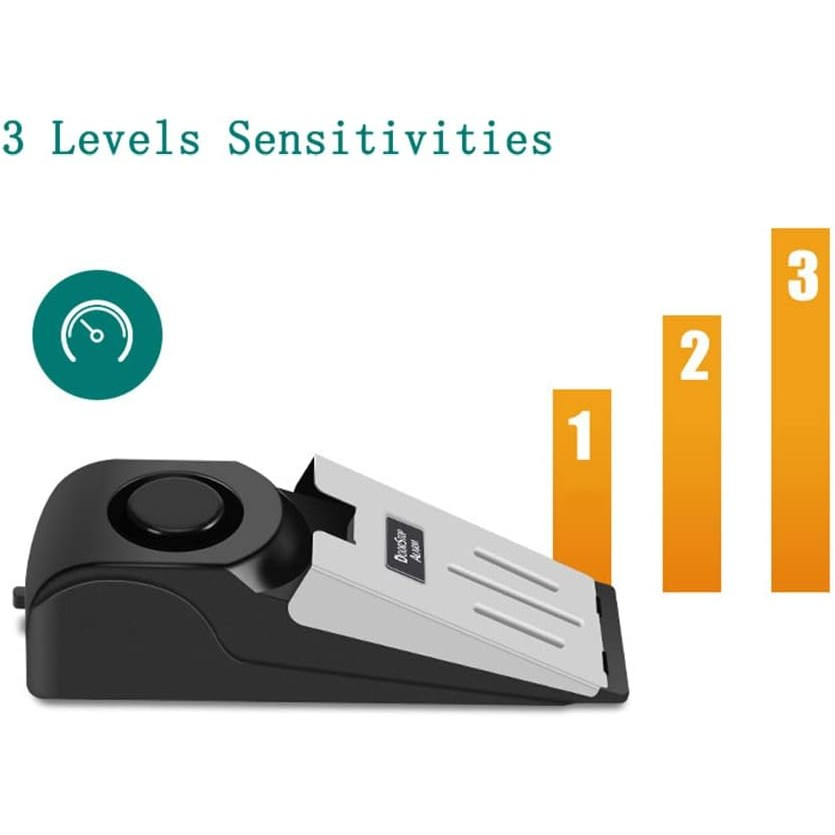 Trepte Reglabile de Sensibilitate: Acest opritor pentru ușă dispune de 3 trepte de sensibilitate pe care le poți ajusta în funcție de necesitățile tale. Astfel, poți adapta setările pentru a preveni activarea accidentală a alarmei în cazul în care dorința este de a o folosi în medii cu trafic.