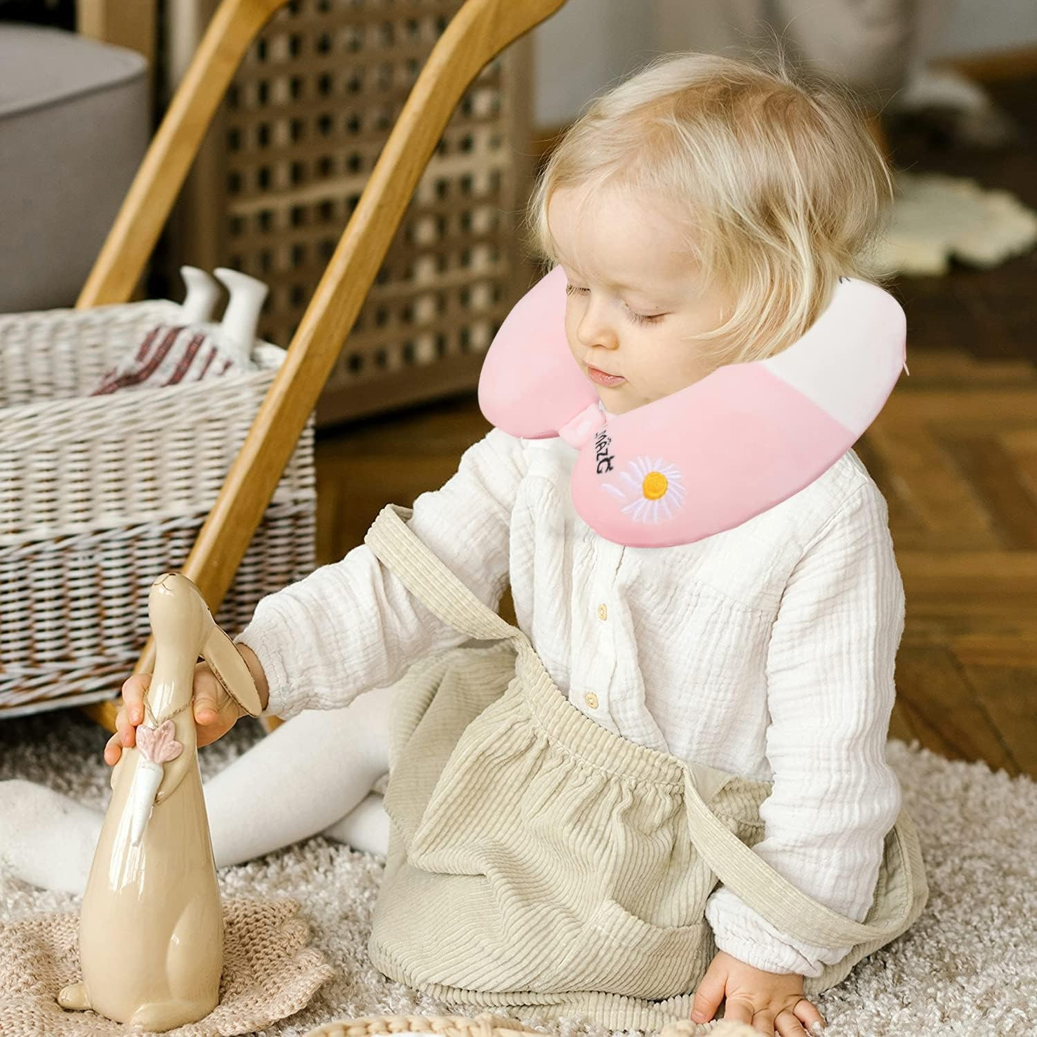 Perna de Calatorie in Forma de U, , Pentru Gat si Cap, Umplutura din Spuma cu Memorie, 30x30 cm, Model Iepuras, Accesoriu de Voiaj, Birou, Masina, Sistem Prindere Capse, Roz-Alb