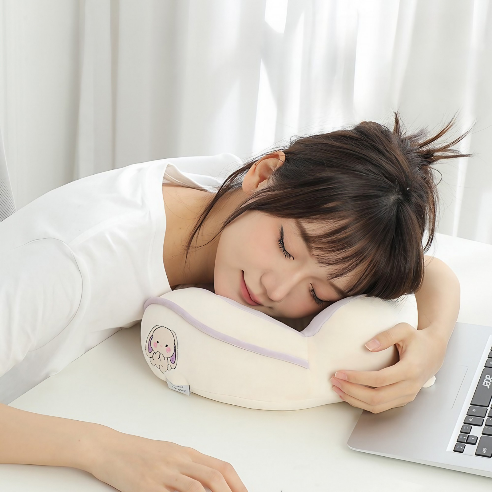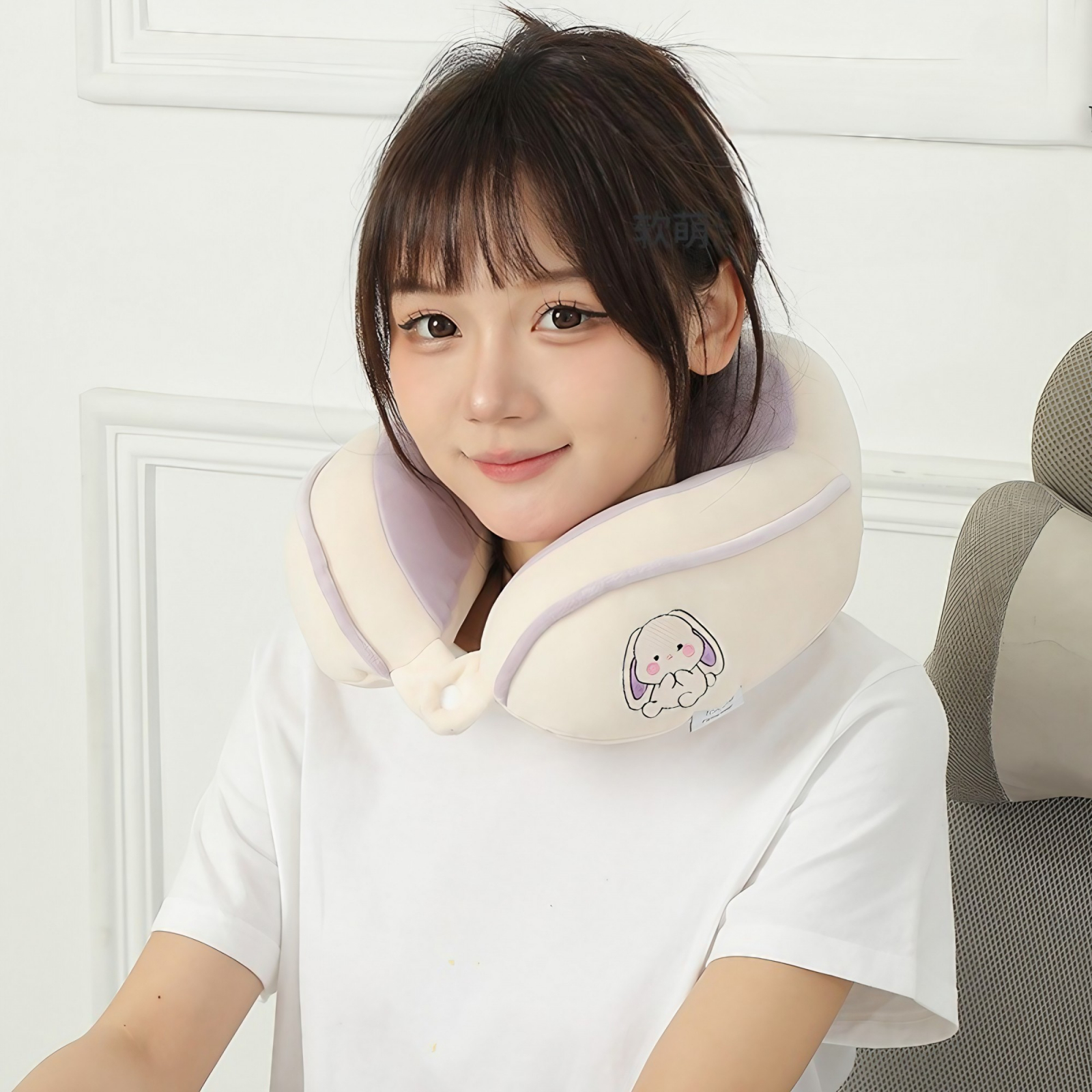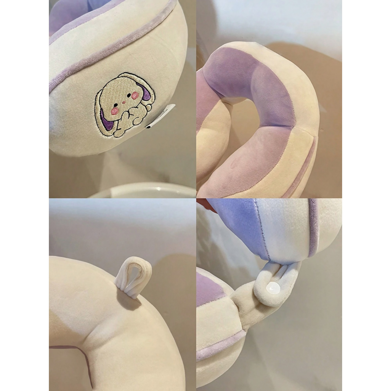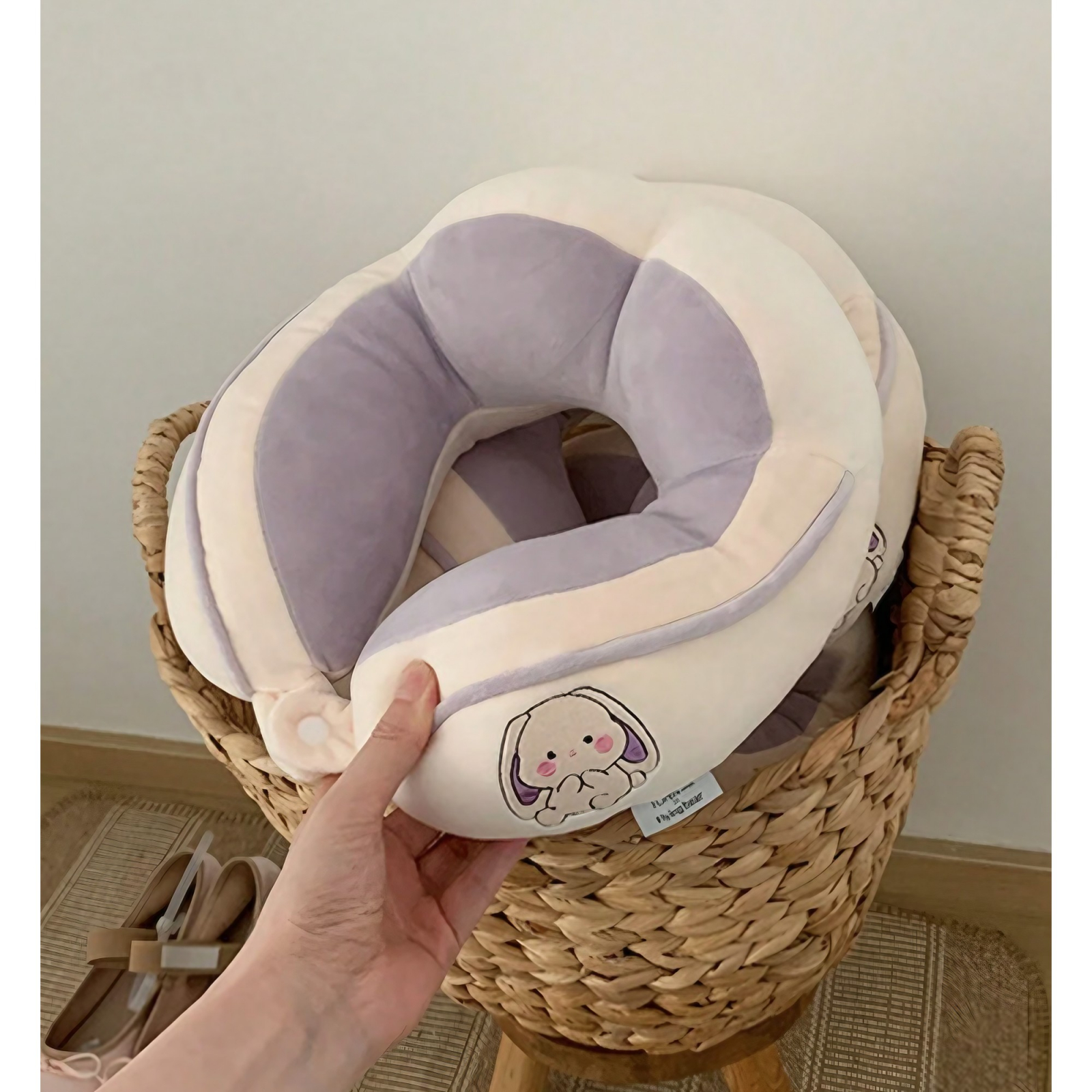 Perna de Calatorie, Flippy, Pentru Gat si Cap, Umplutura din Bumbac, cu Model Brodat Iepure, Lila, reprezintă soluția perfectă pentru confortul în călătorii și momentele de relaxare.