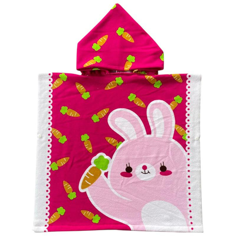 Poncho-ul pentru copii cu gluga si imprimeu vesel cu iepuras roz si morcovi este alegerea ideala pentru momentele de relaxare dupa baie, la piscina sau la plaja. Cu o dimensiune practica de 56x60 cm, este usor de purtat si ofera acoperire si protectie optima pentru cei mici.Realizat din material moale si absorbant, poncho-ul este confortabil si delicat cu pielea sensibila a copiilor. Gluga protejeaza capul de vant si contribuie la uscarea rapida a parului, in timp ce croiala lejera permite libertate de miscare. Designul colorat si jucaus il face adorat de copii si perfect pentru fetite.Ideal pentru utilizare acasa sau in vacanta, acest poncho este un accesoriu practic si atragator, potrivit pentru copii cu varste intre 2 si 6 ani. Usor de transportat, util si plin de personalitate – un must-have pentru sezonul cald.