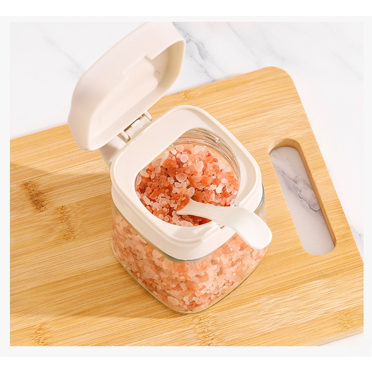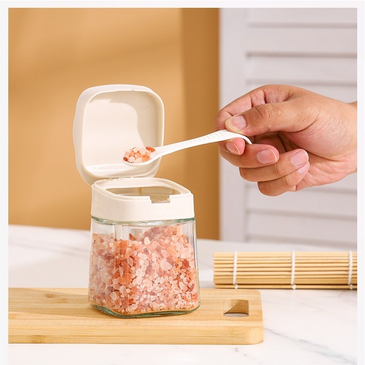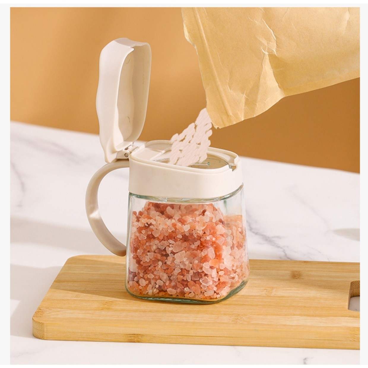 Un accesoriu practic și elegant pentru orice bucătărie – Recipientul pentru Condimente Flippy din sticlă, cu mâner și linguriță inclusă, este ideal pentru depozitarea condimentelor solide în siguranță și cu stil.