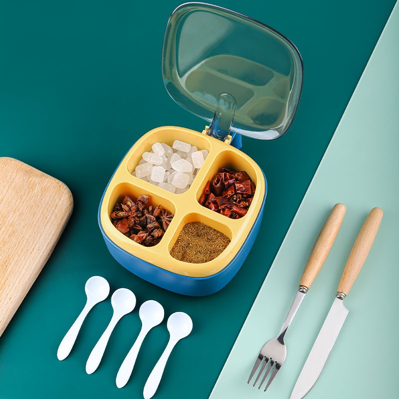 : Acest recipient dispune de 4 casuțe separate, care permit depozitarea și organizarea condimentelor, precum sare, cimbru, piper și alte condimente preferate. Astfel, vei putea găsi rapid condimentele dorite și vei evita amestecarea lor.