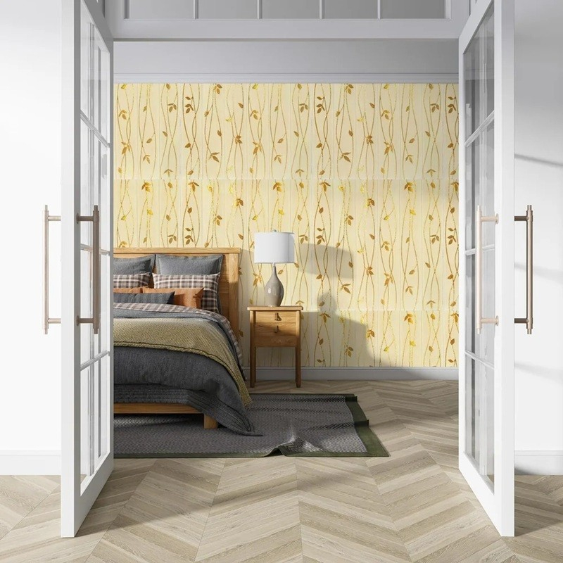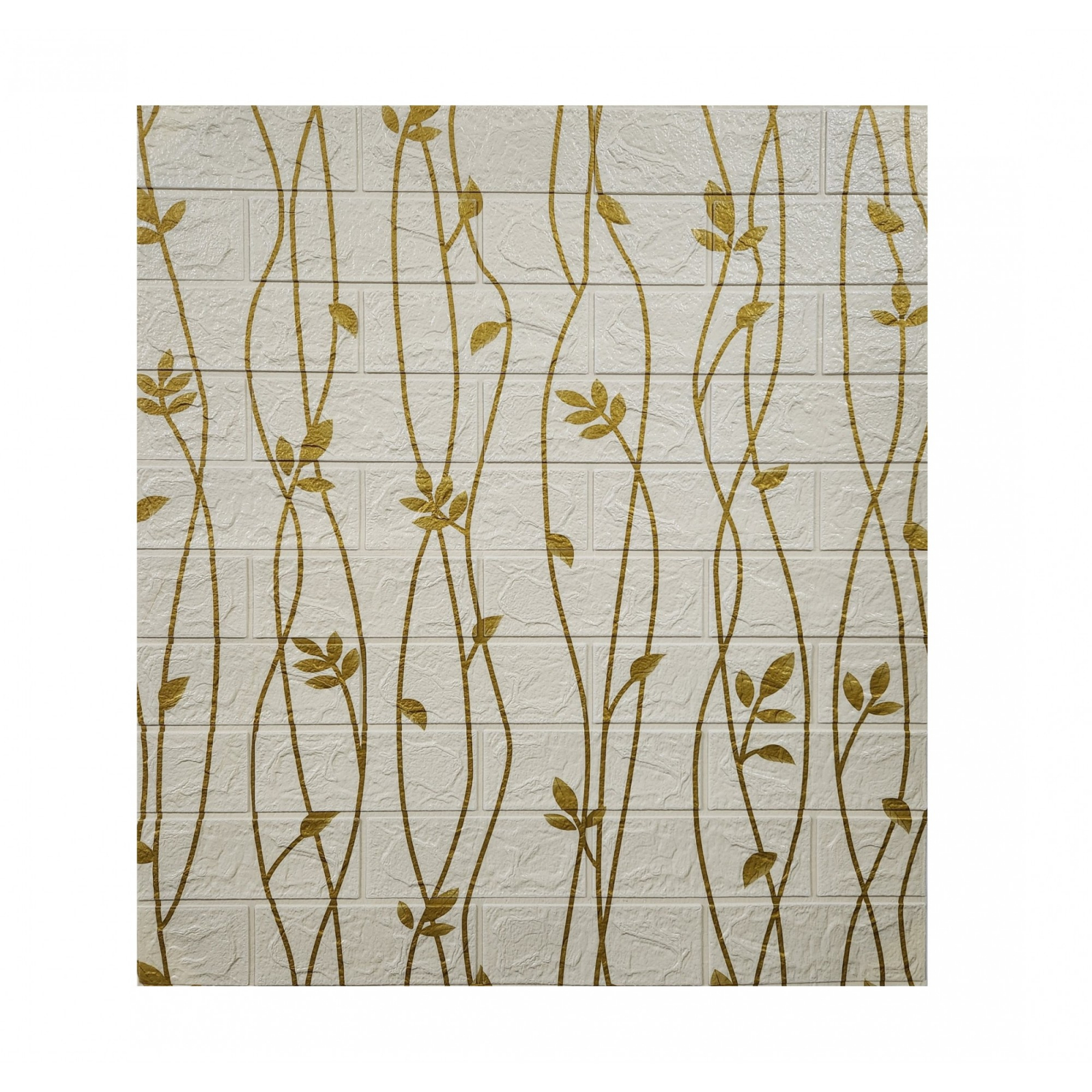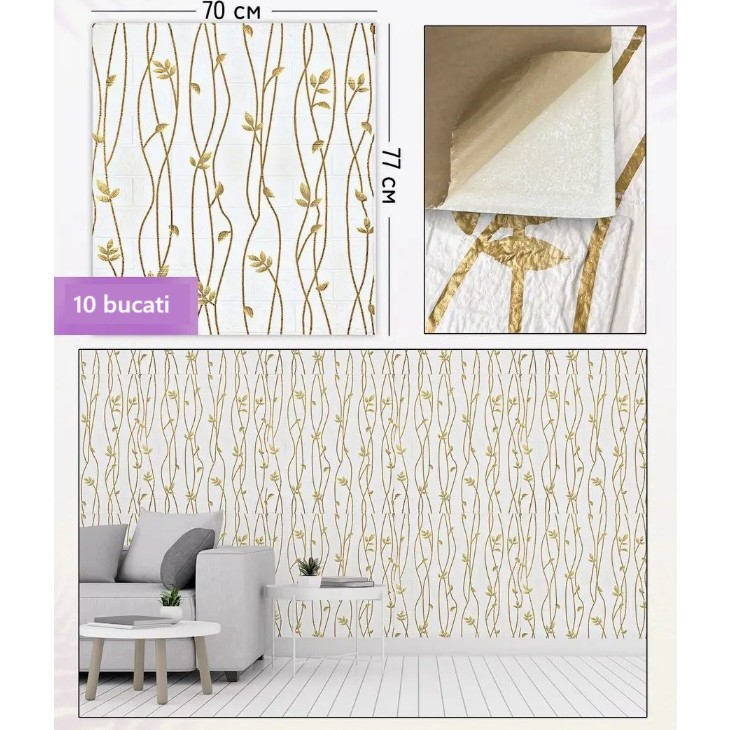 Design 3D realist: Textură de cărămidă cu imprimeu frunze aurii, aducând un aer modern și elegant oricărui spațiu.