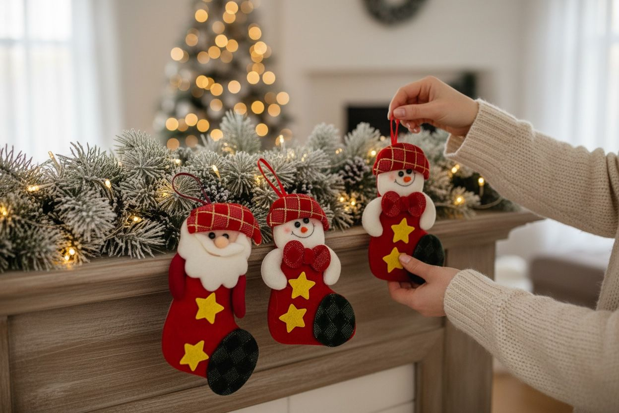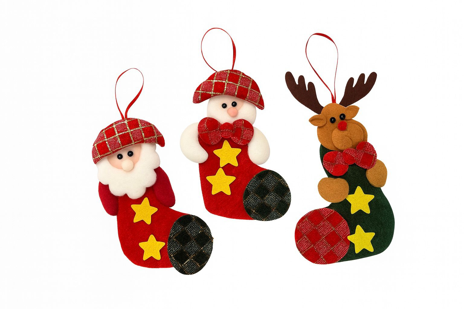 Set de 12 decoratiuni Craciun in forma de ciorapel festiv, realizate din material textil moale, cu personaje tematice: Mos Craciun, om de zapada si ren. Fiecare decoratiune este prevazuta cu agatatoare rosie pentru a fi usor de prins in brad, pe ghirlande sau la ambalarea cadourilor.