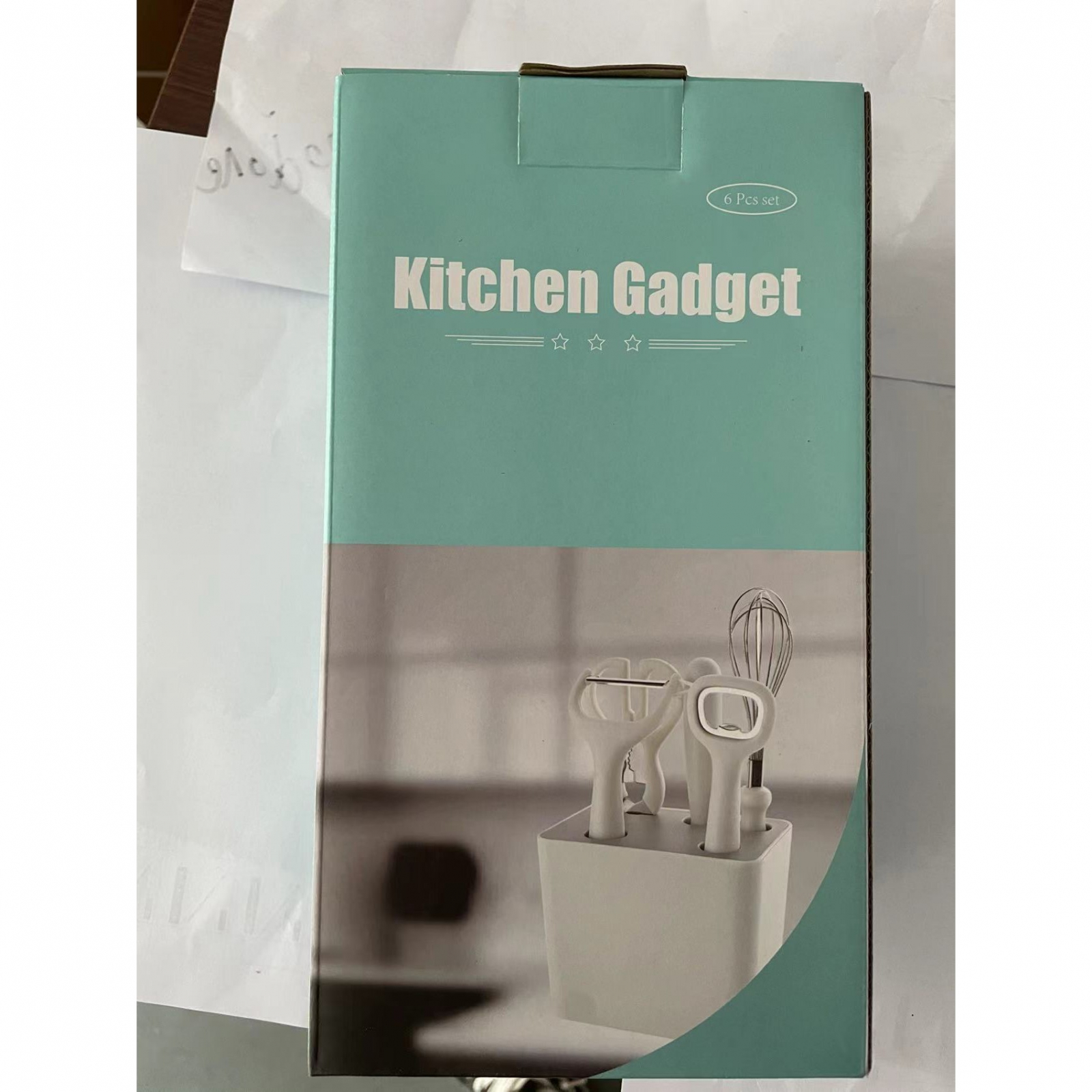 Informatii utile: Culoare:Alb, Material:Plastic Inox, Continut pachet:Set 6 ustensile bucatarie , cu suport inclus, desfacator, curatator legume, foarfeca, cutit, tel, ABS si inox, alb, Numar piese:6, Componente set:Desfacator bere Curatator Foarfeca Tel Taietor Suport ustensile, Material maner:Plastic