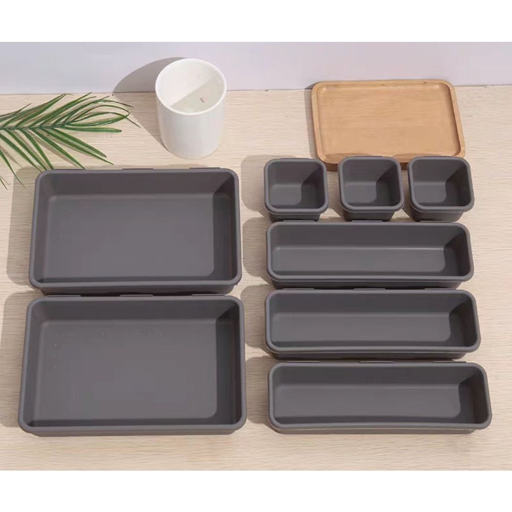 Set 8 cutii depozitare, pentru sertar, cosmetice, ustensile bucatarie, textile, plastic, gri, Flippy, 23.5 x 16 cm