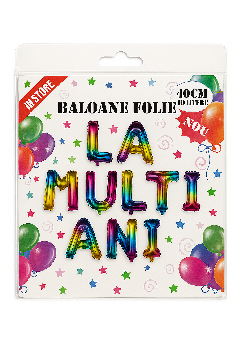 Celebreaza orice ocazie speciala cu acest set de baloane folie LA MULTI ANI curcubeu, format din 10 litere de 40 cm, ideale pentru decoruri spectaculoase si fotografii memorabile. Culorile tip curcubeu ofera un efect vizual modern si vesel, perfect pentru aniversari, petreceri tematice, zile de nastere sau surprize festive.