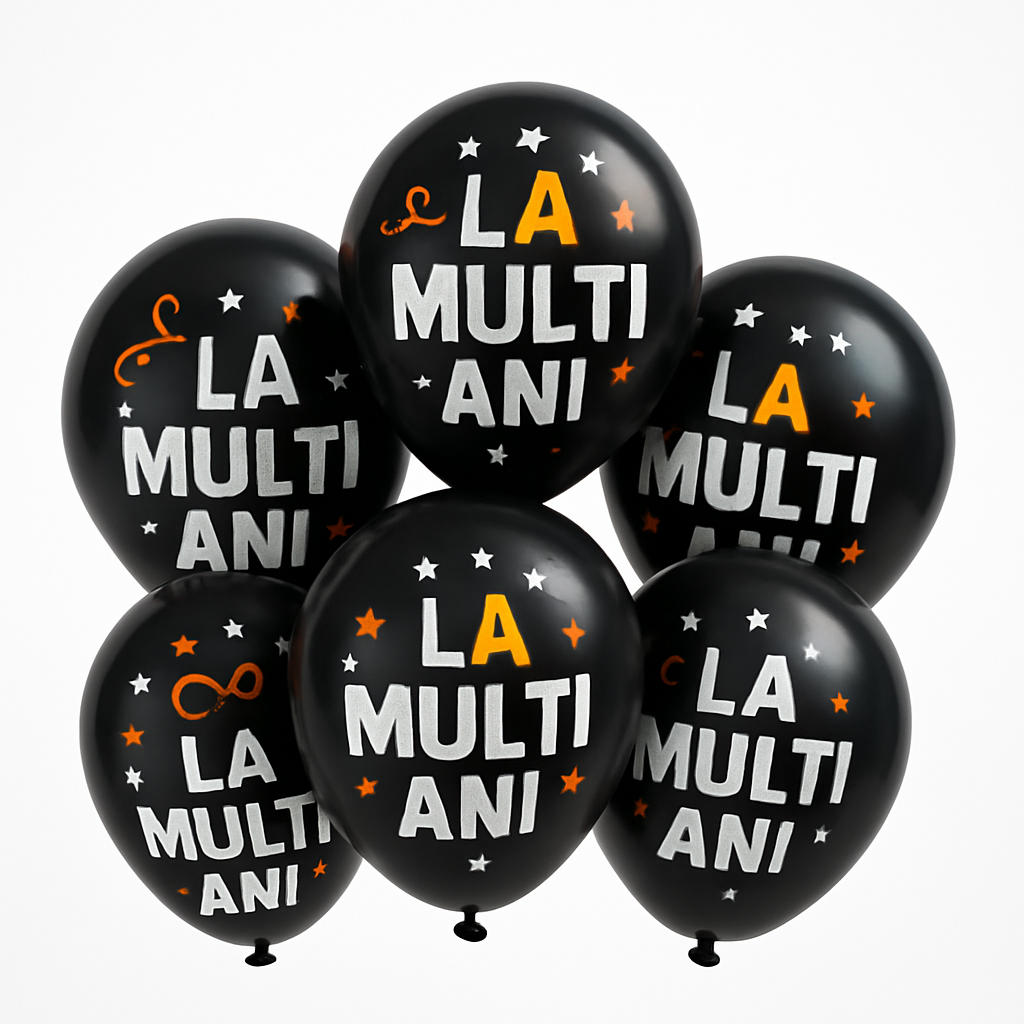 Adauga un plus de stil si energie oricarei aniversari cu acest set de baloane latex LA MULTI ANI, de culoare neagra, imprimat color pentru un efect modern si elegant. Baloanele au dimensiunea de 30 cm si sunt perfecte pentru petreceri, decoruri tematice sau surprize festive.