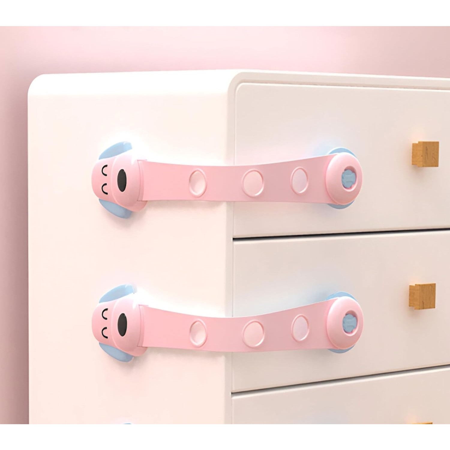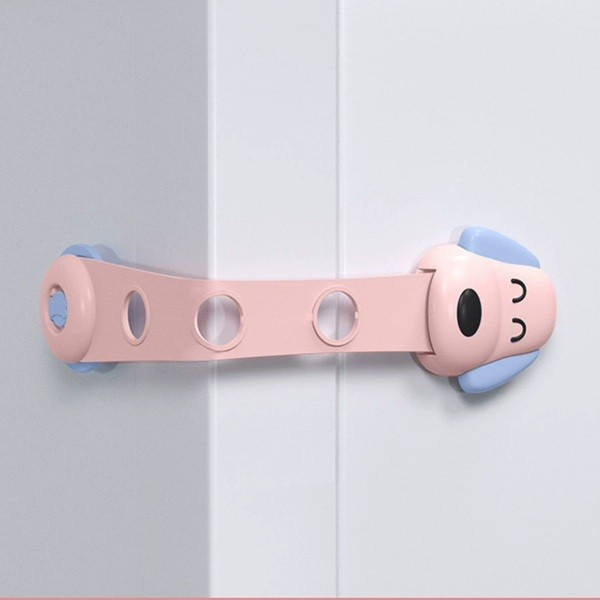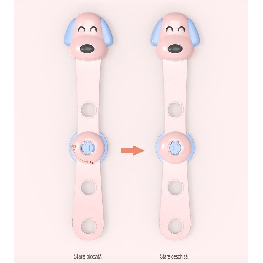 Informatii utile: Pentru:Baieti Fete, Latime:5 cm, Varsta:6-9 luni, Tip produs:Sistem blocare mobilier, Tip montare:Adeziv, Caracteristici cheie:Previne accidentarea copiilor Dimensiune ajustabila, Lungime:24 cm, Material:Plastic, Culoare:Roz