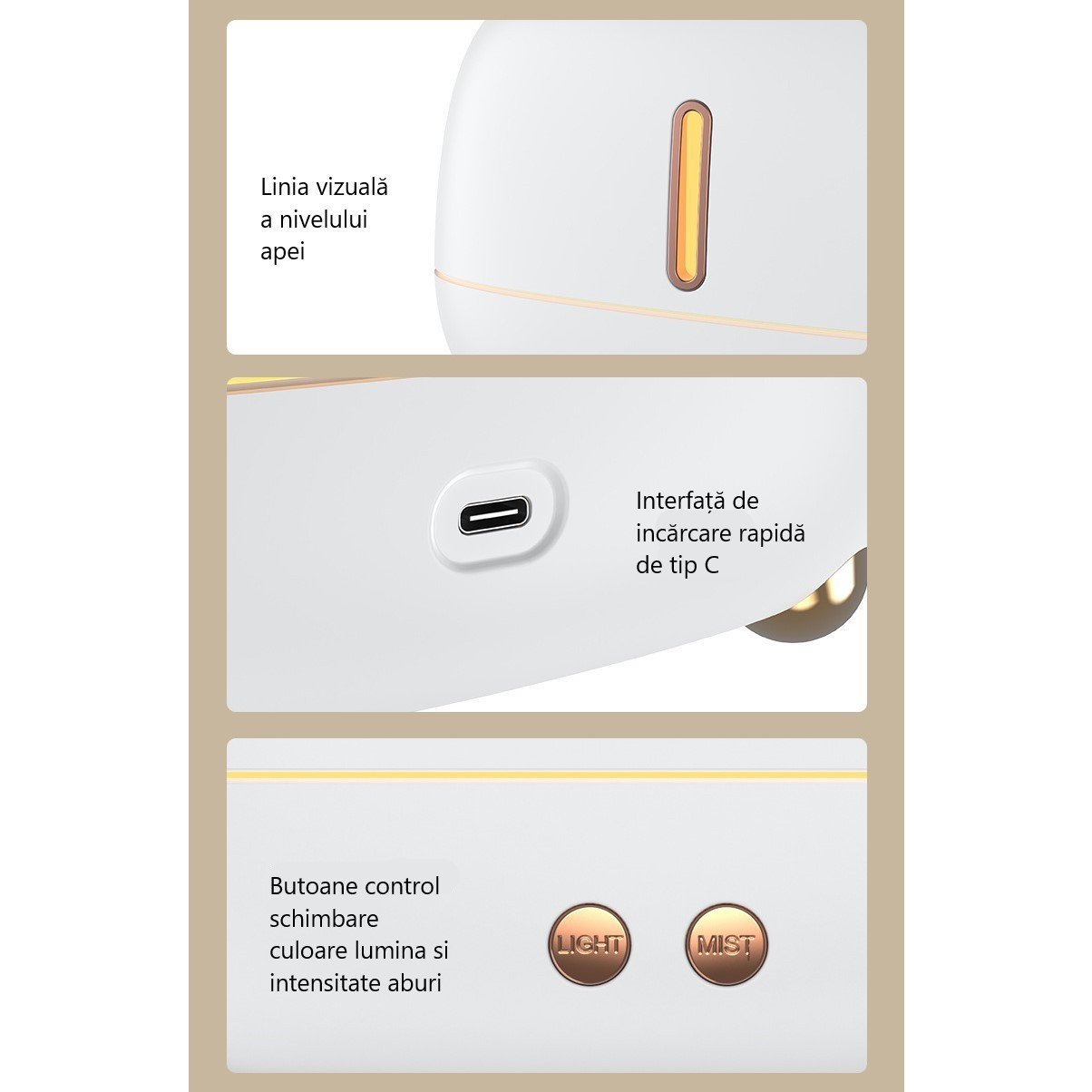 Umidificatorul este un difuzor de aroma elegant si modern. Ofera o iluminare intima cu LED-uri cu consum redus de energie, care confera vaporilor emisi un efect de flacara.