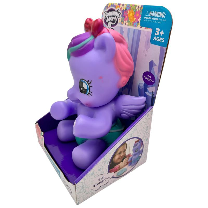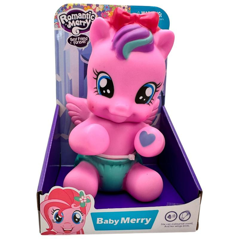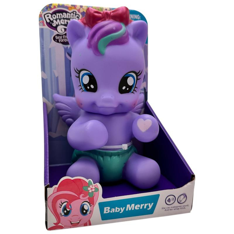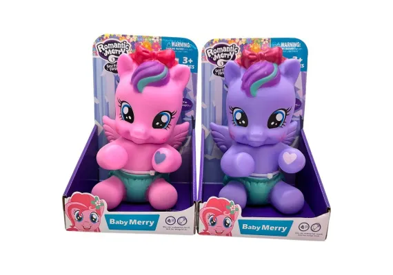 Bebelusul ponei este o jucarie interactiva pentru copii care emite sunete gingase si lumineaza in timpul joculuiAre un design adorabil cu aripi si fundita si este disponibil in culori atractive precum roz sau movDimensiunile sale sunt de aproximativ 215x14x12 cm fiind usor de manevrat de catre cei miciEste recomandat pentru copii cu varsta de peste 3 ani si este perfect pentru joaca de rol si dezvoltarea creativitatiiFunctioneaza cu baterii si este ambalat intr-o cutie de prezentare potrivita pentru oferit cadou