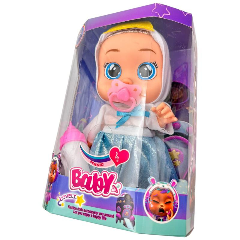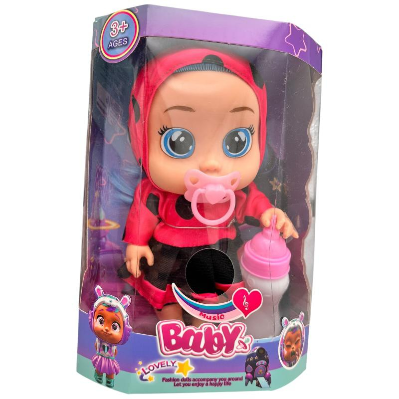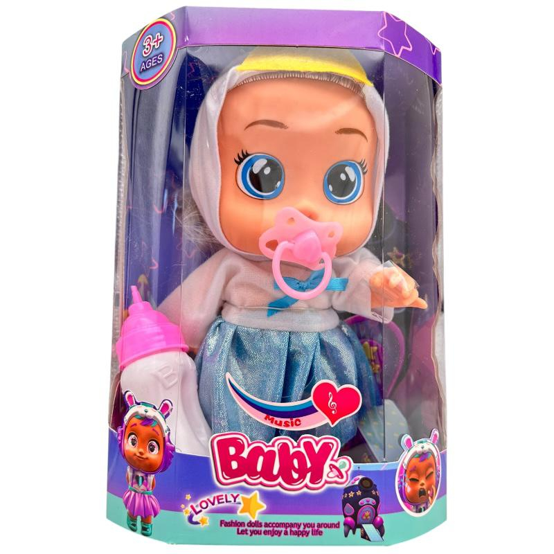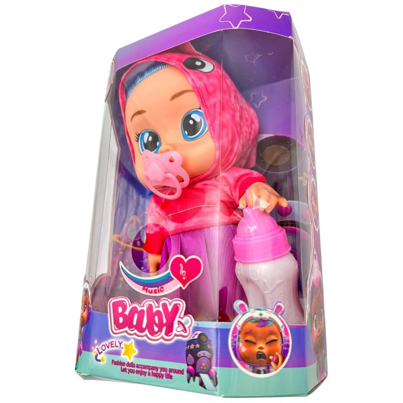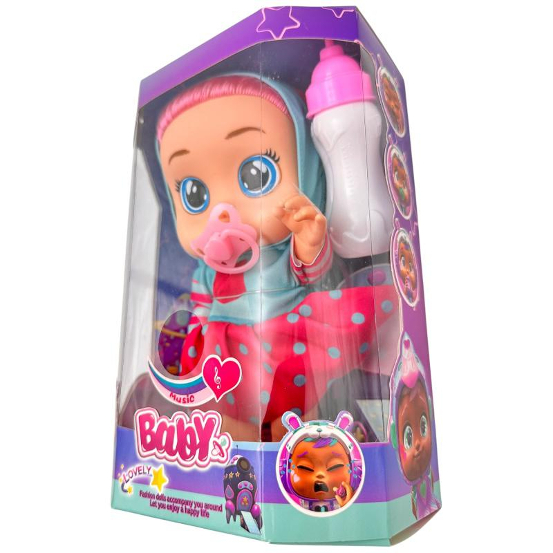 Papusa bebelus muzicala cu design adorabil si ochi mari este ideala pentru copiii pasionati de jocuri de rol si ingrijirea papusilor Aceasta jucarie draguta vine cu biberon roz si suzeta si are dimensiunea de aproximativ 22.5 cm fiind usor de tinut in brate si transportat Papusa reda sunete muzicale care atrag atentia si stimuleaza imaginatia celor mici Este disponibila in mai multe variante de culoare si tinute colorate fiind recomandata copiilor de la varsta de 3 ani in sus O alegere perfecta pentru un cadou creativ si distractiv