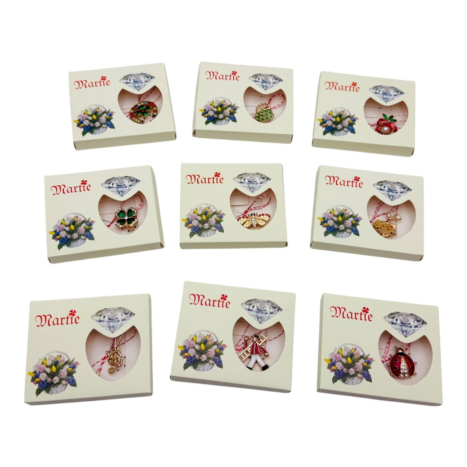 Brosa Martisor in cutiuta cu floricele si diamant, modele combinate, 9×7.5cm,