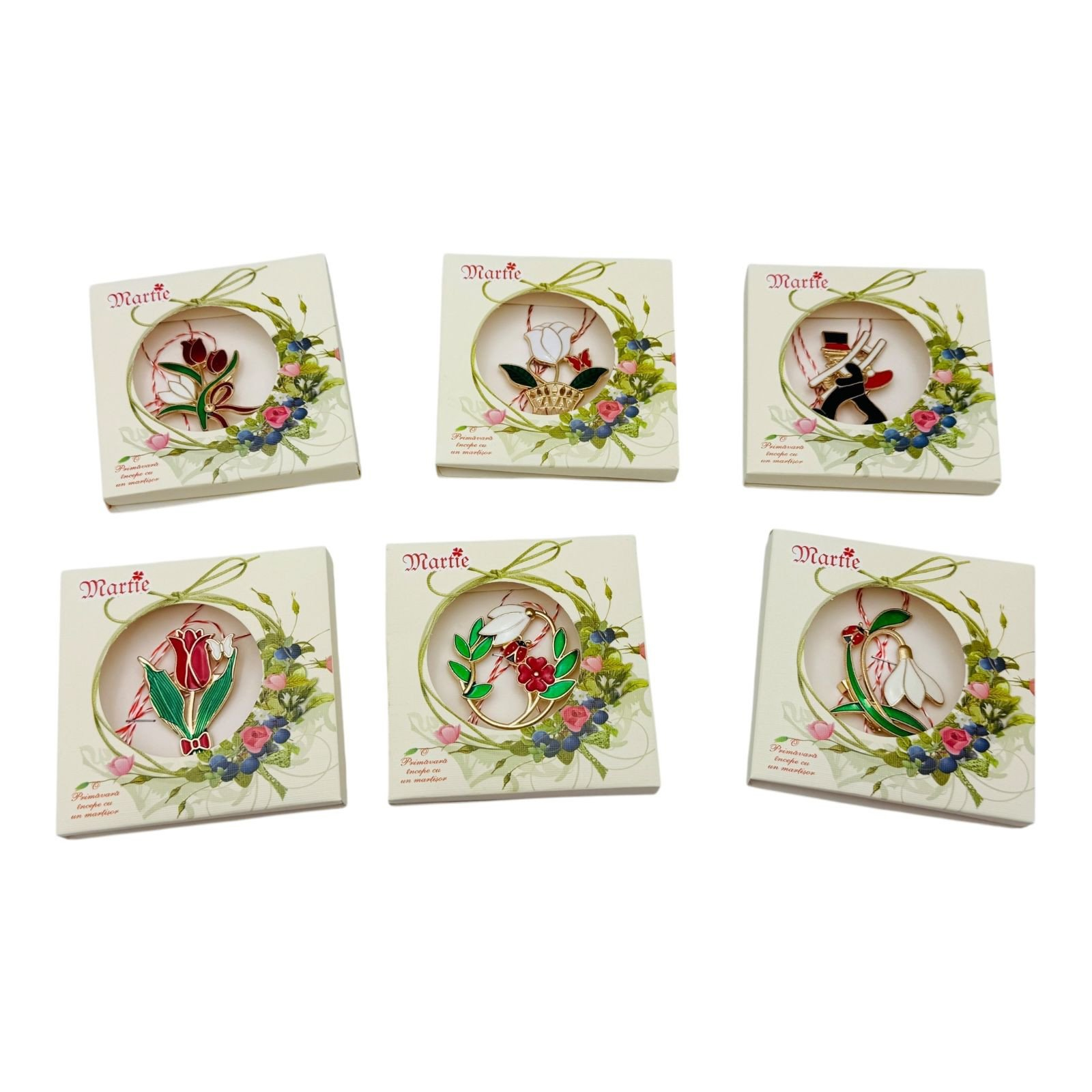 Brosa Martisor marime medie, ambalata in cutiuta deosebita, modele combinate, 8.5×8.5cm,