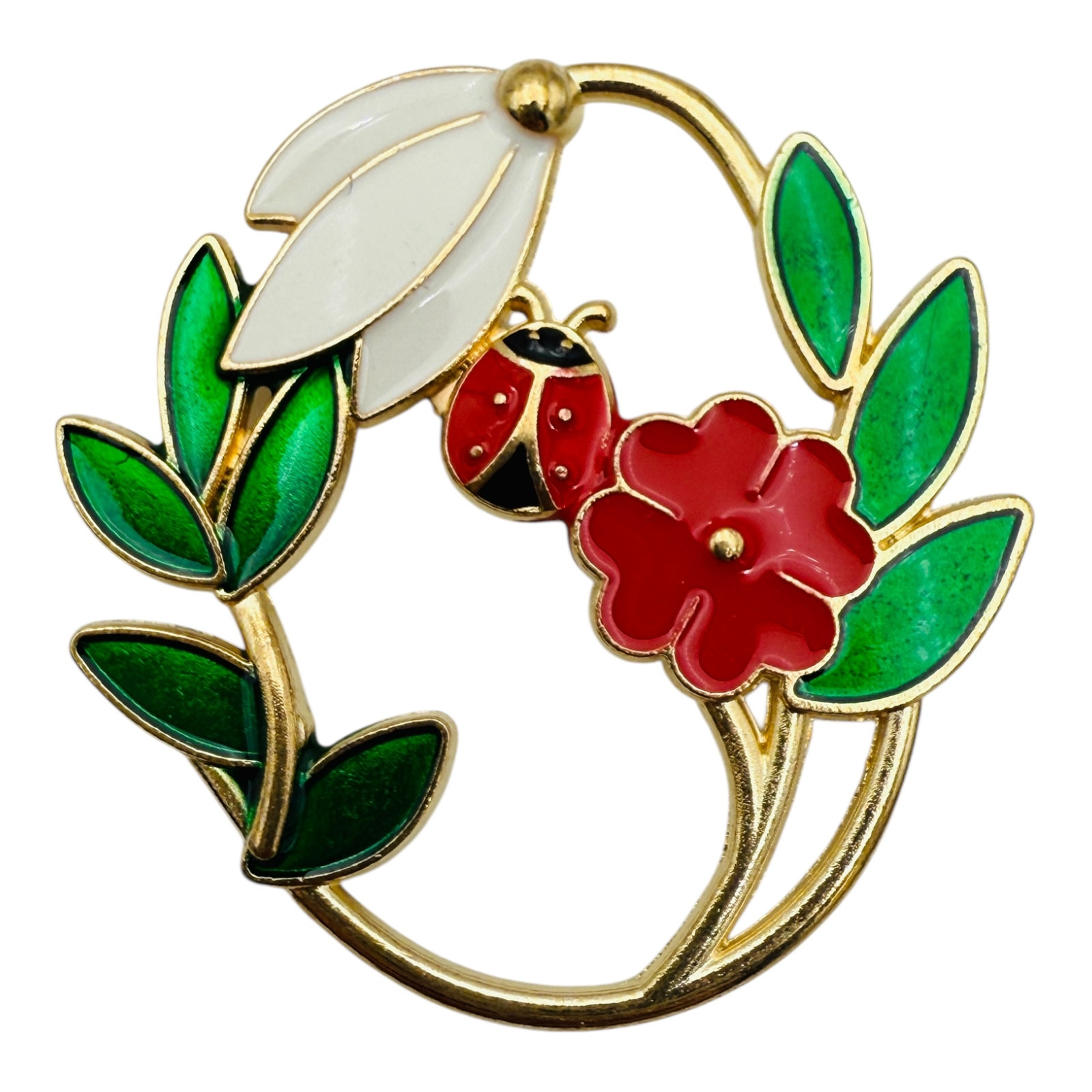 Brosa Martisormarime medie, aranjament floral cu buburuza, ediție 2025, 4.5x3.5 cm