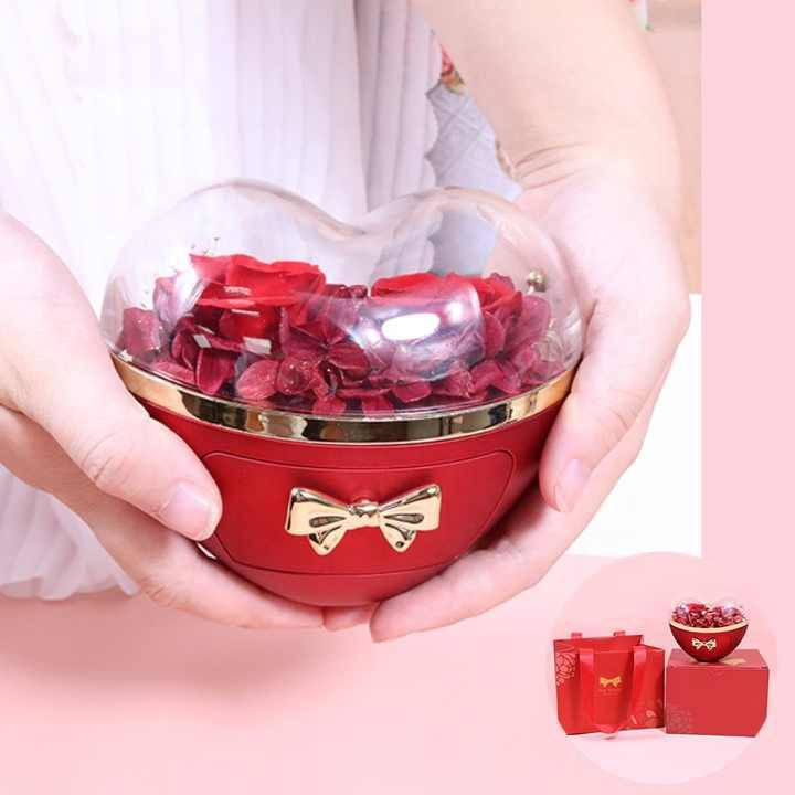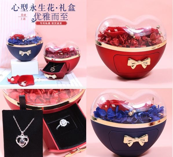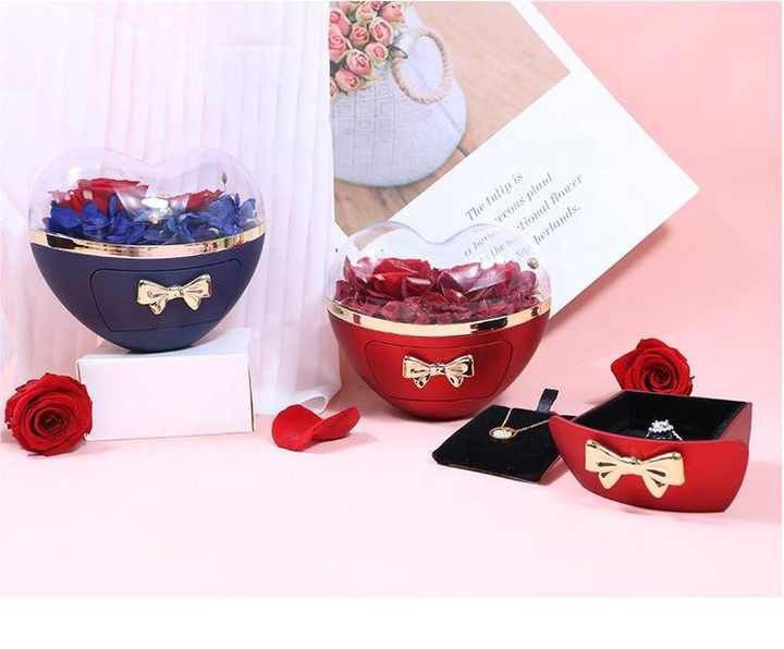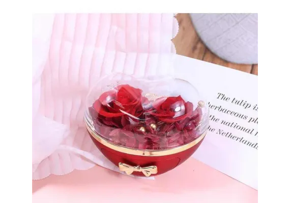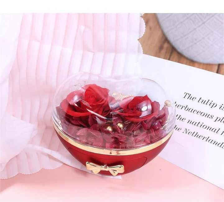 Caseta decorativă în formă de inimă reprezintă o combinație remarcabilă de eleganță, funcționalitate și simbolism romantic. Cu dimensiuni ideale de 15×12 cm, această piesă unică este concepută să impresioneze și să devină un cadou memorabil pentru persoanele dragi. Caseta este decorată cu doi trandafiri criogenați de un roșu intens, care își păstrează prospețimea și frumusețea naturală timp de mai mulți ani, fără a necesita întreținere specială. Alături de aceștia, florile naturale adaugă un plus de delicatețe și autenticitate, completând armonios designul romantic.Practicitatea acestei casete este asigurată de sertarul integrat, perfect pentru păstrarea în siguranță a bijuteriilor și accesoriilor personale. Sertarul este prevăzut cu un mecanism discret și ușor de utilizat, ceea ce face ca această piesă să fie nu doar decorativă, ci și extrem de utilă.Realizată cu atenție la detalii, caseta este fabricată din materiale de înaltă calitate, iar finisajele fine și nuanța roșie vibrantă îi conferă un aspect premium. Este ideală pentru , fiind potrivită pentru diverse ocazii speciale, precum Valentine’s Day, aniversări, zile de naștere, logodne sau alte momente în care dorim să oferim un cadou cu adevărat deosebit.Această casetă nu este doar un simplu obiect decorativ, ci o expresie a iubirii și eleganței, un simbol al frumuseții atemporale. Cu un design care atrage privirile și o semnificație profundă, ea reușește să aducă un strop de magie oricărui moment special.